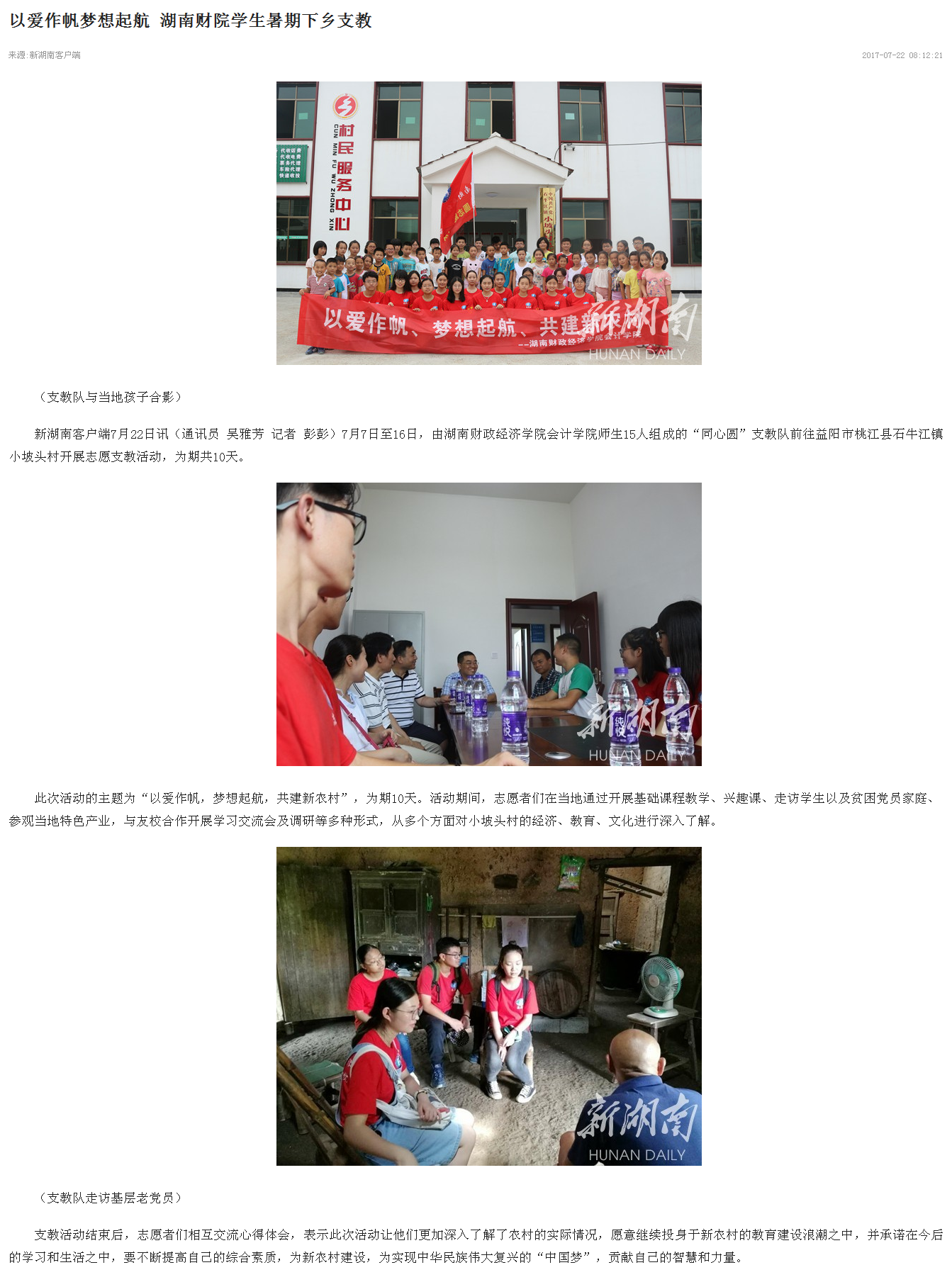 7月19日、22日,红网、新湖南相继对Beat365学生“三下乡”开展支教活动的相关情况进行了报道。 红网链接:http://gov.rednet.cn/c/2017/07/19/4363991.htm 新湖南链接:http://m.voc.com.cn...