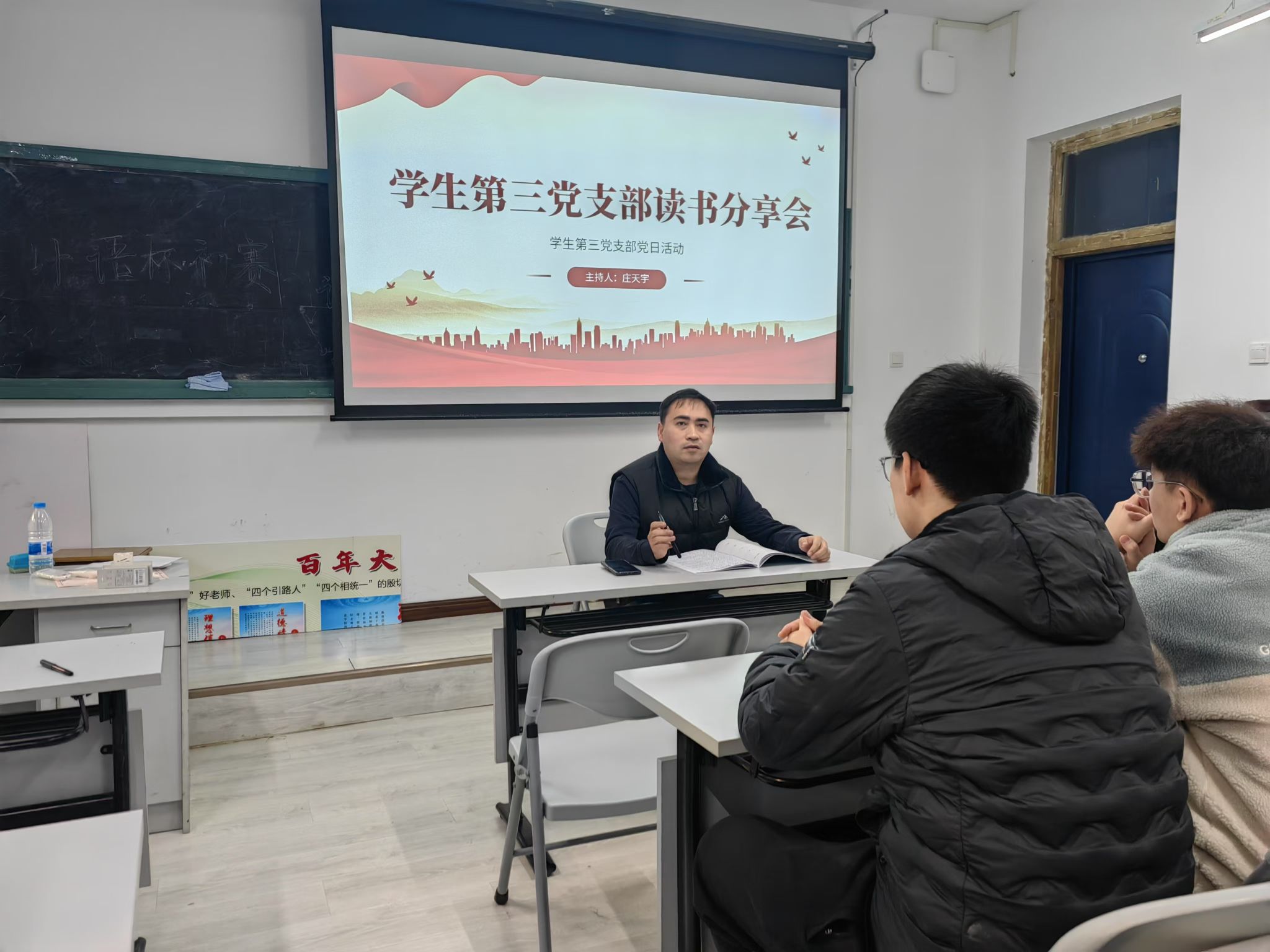 2024年12月23日,院党委副书记连凯宇深入联系学生第三党支部,在基础楼120举办12月党日活动读书分享会。活动由学生第三党支部书记庄天宇主持,党支部全体党员和预备党员参会。各小组活动围绕多部富有深刻意义的书籍展开了深入学习和交流,激发了思想共鸣,营造了浓厚的学习氛围。