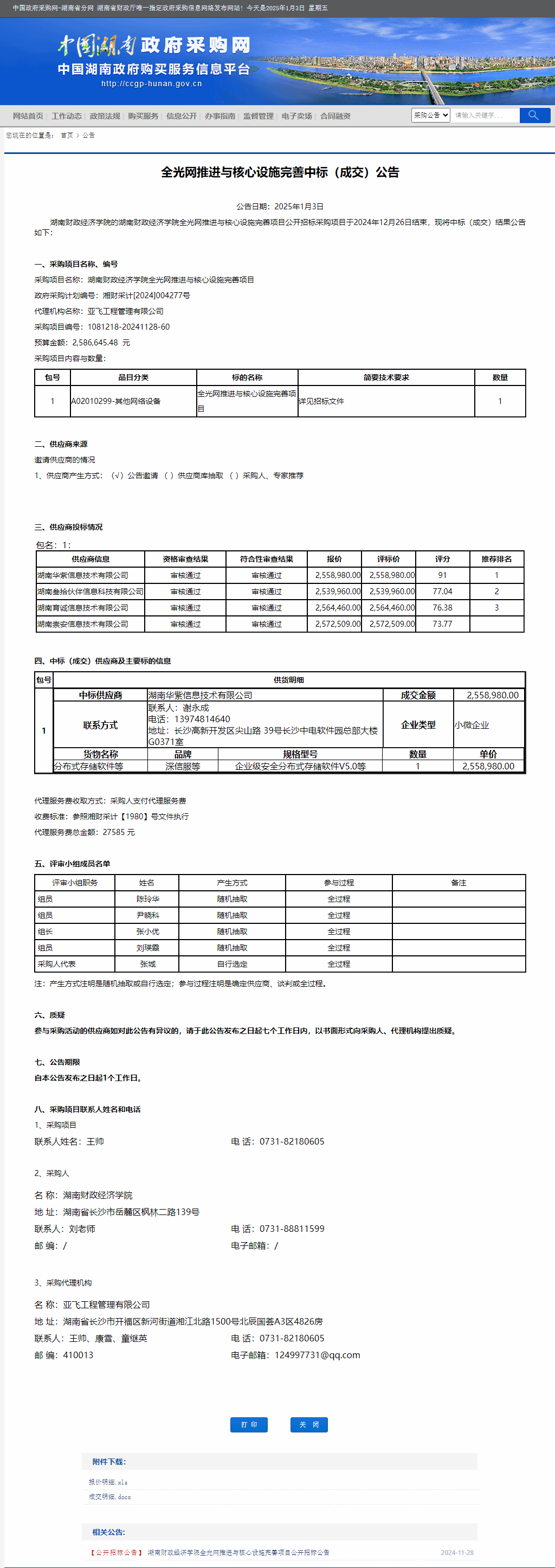 湖南省政府采购网:Beat365唯一官方网站全光网推进与核心设施完善中标(成交)公告