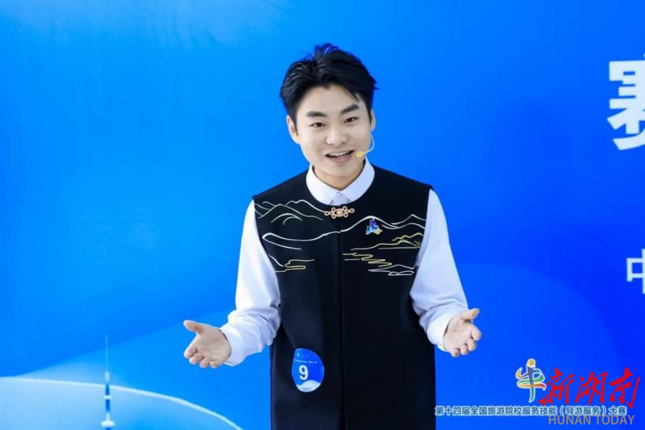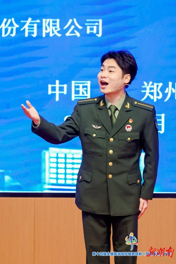 比赛分理论测试、导游讲解(现场)和才艺展示三个环节。熊一郎发挥出色,理论测试拿到满分;在现场讲解环节,他以研学导游身份带来了一场生动且民族味十足的研学解说;在才艺展示环节,他一首高亢激昂的《小白杨》,深深打动在场评委获得高分。