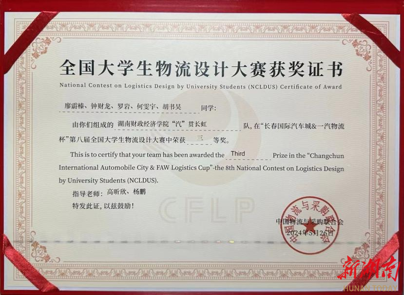 学校参赛团队“汽”贯长虹,由2022级物流管理专业的廖霨榛(队长)、何雯宇、胡书昊,2021级物流管理专业的钟财龙和2022级数据科学与大数据技术专业的罗岩5位同学组成,在工商管理学院高昕欣、杨鹏两位老师指导下,参赛作品《新质生产力赋能长春一汽物流园区高质量发展方案设计》荣获全国三等奖,5位同学获得《物流职业能力等级证书(中级)》。