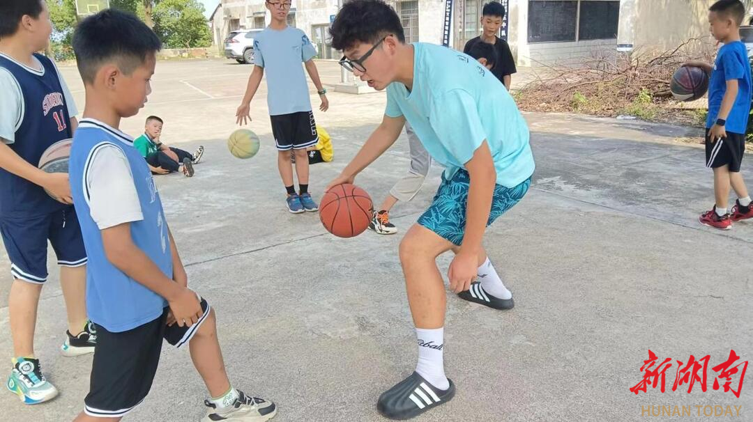 (志愿者指导孩子们如何运球)
