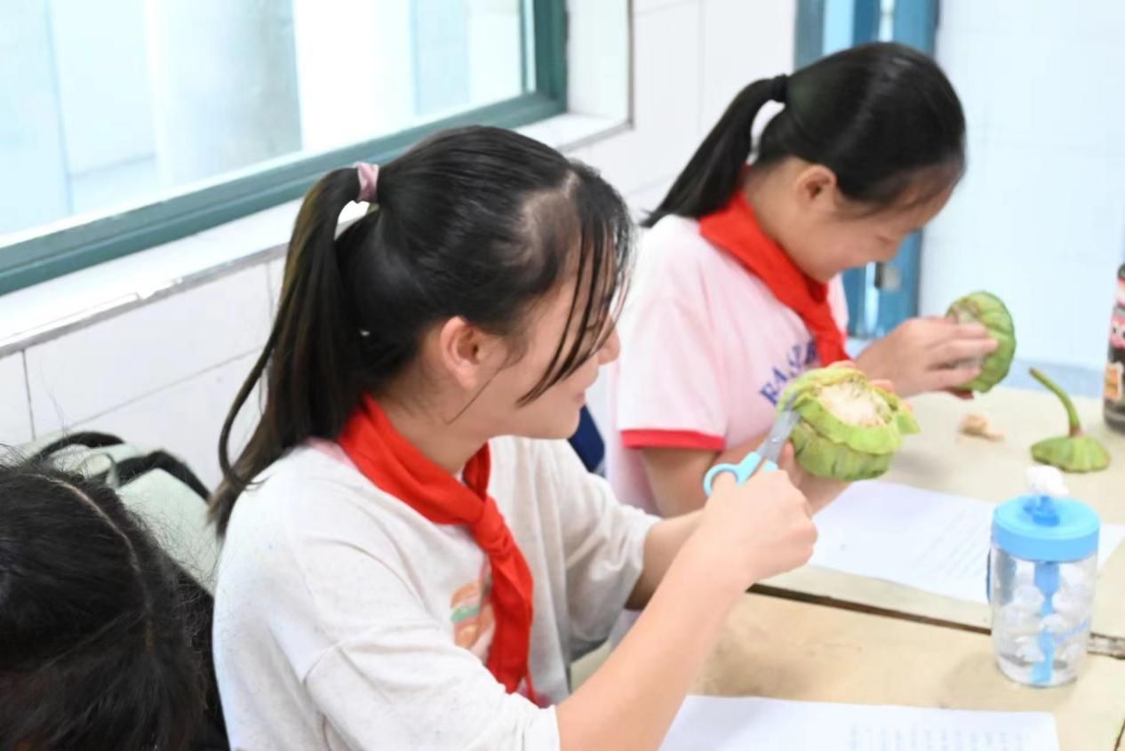在劳动教育实践中,志愿者们带领同学们动手制作莲蓬杯垫,直观感受到莲花“中通外直,不蔓不枝”的正直特性,初步建立起对廉洁文化的感性认识。随后的科学课、诵读名篇环节,同学们在剥开莲子、莲叶的过程中了解莲子的结构以及莲叶“滴水不沾”的特性,并诵读历代咏莲名篇,进一步领略古人寓于莲花清廉自守的崇高精神,在文学的浸润中提升对廉洁文化的理解与认同。为丰富实践体验,活动还融入了艺术创作环节,同学们亲手绘制“夏日荷风扇”,将廉洁理念融入画笔之下,以画传情、以艺载道。志愿者们还为同学们讲述了古今清廉典范故事,激励同学们以史为鉴,向先贤学习。