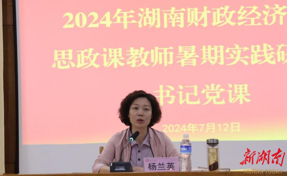 湖南财院党委书记杨兰英、党委副书记苏玲来到研修基地看望了研修班学员。杨兰英为学员们带来了一堂生动的“书记党课”。杨兰英在党课中指出,山东是儒家文化的发源地、中华文明的重要发祥地,也是新时代用好中华优秀传统文化、红色文化开展大思政课的先行者。全体教师要准确理解学校组织思政课教师到山东开展暑期研修的初衷,从三个方面努力以确保达成预期目标。一是珍惜学习机会,以虔敬之心投入学习。要深刻感悟沂蒙精神,学习临沂在用好中华优秀传统文化、红色文化开展思想政治理论课的成功经验和创新举措。二是坚持问题导向,以奋进之心谋发展。要以如何助推学校高质量发展为问题意识,主动学习、认真思考,切实掌握好新时代思政课教师讲好思政课的看家本领。三是严守研修纪律,以爱校之心维护荣誉。要做到学纪、知纪、明纪、守纪,时刻谨记自己的思政课教师身份,以实际行动维护学校声誉,维护思政课教师队伍形象。