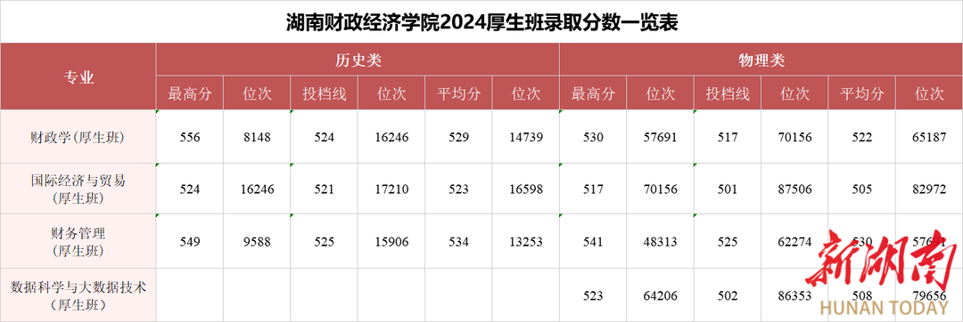 2024年在湘生源质量提升显著。今年学校历史类投档成绩最高分560(超出特殊类型控制线64分),物理类投档成绩最高分556(超出特殊类型控制线75分)。学校厚生实验班录取成绩攀升,财政学(厚生班)历史类最高分达556,位次8148,平均分达529,超出特殊类型控制线33分;财务管理(厚生班)物理类最高分达541,位次48313,平均分达530,超出特殊类型控制线49分。另外,新设专业也备受考生青睐,其中社会工作专业历史类最高分达505,投档线498,平均分达500,超出特殊类型控制线4分。