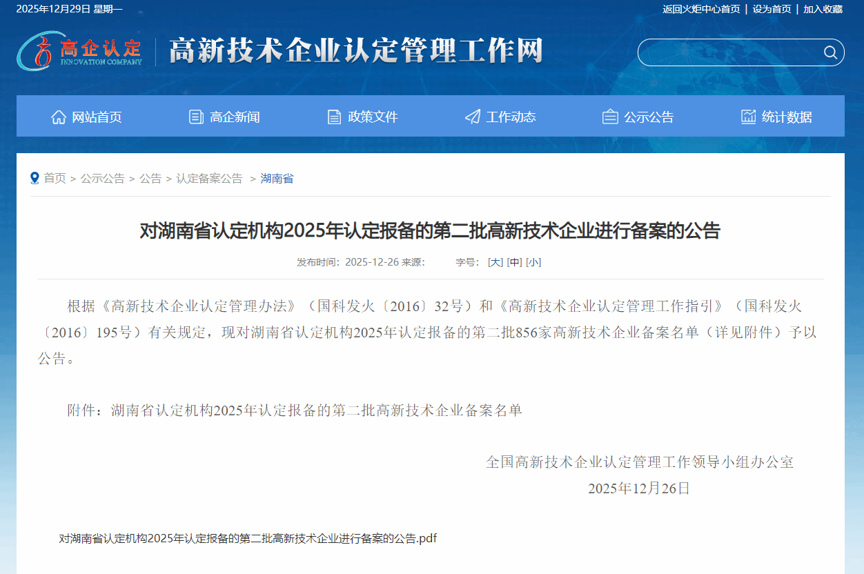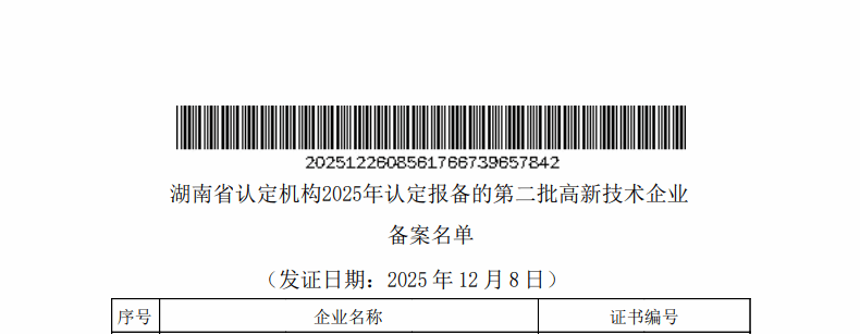 (本网讯)12月26日,全国高新技术企业认定管理工作领导小组办公室发布湖南省认定机构2025年认定报备的第二批856家高新技术企业备案名单,公司顺利通过复审认定,成功获得国家高新技术企业荣誉。