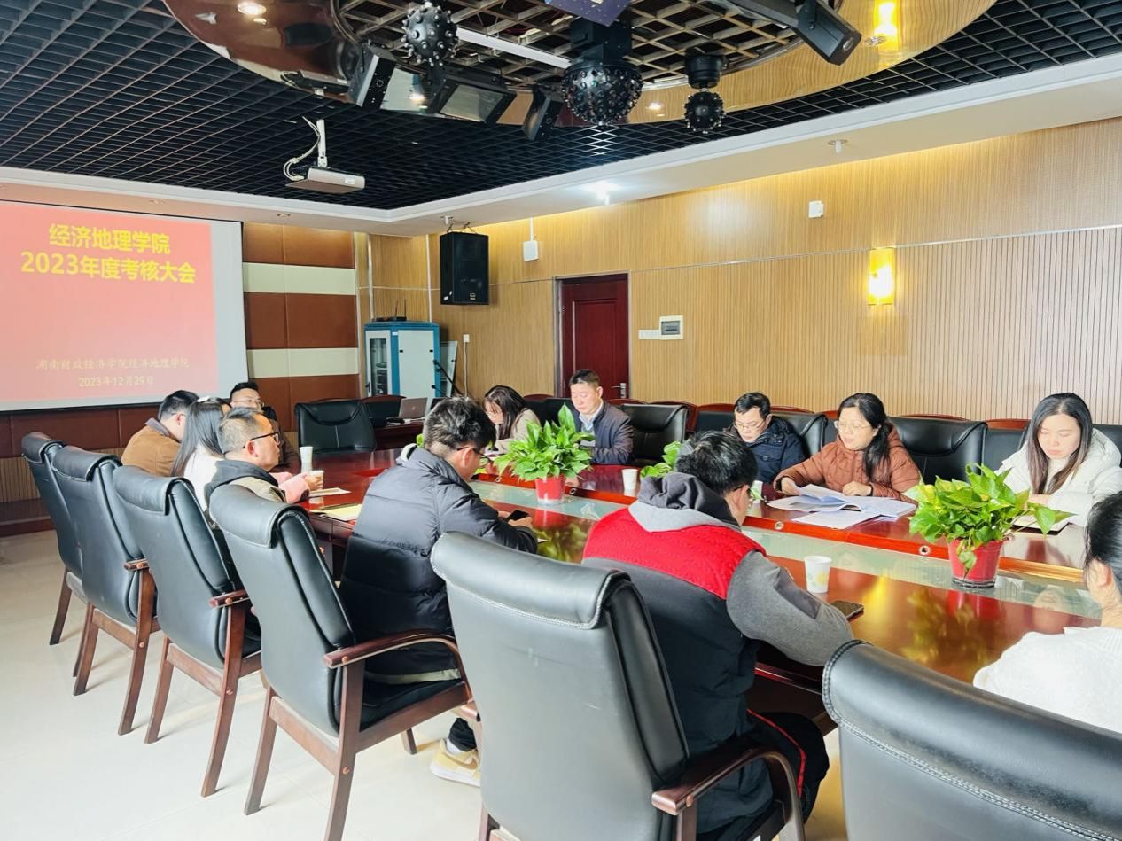 (本网讯)为保证2023年度考核工作顺利开展,2023年12月29日下午,经济地理学院在主校区行政楼1014会议室召开年度考核工作会议。会议由院直属党支部书记姚旭辉主持,院长彭文斌、副院长苏昌贵和全体教职工参加会议。