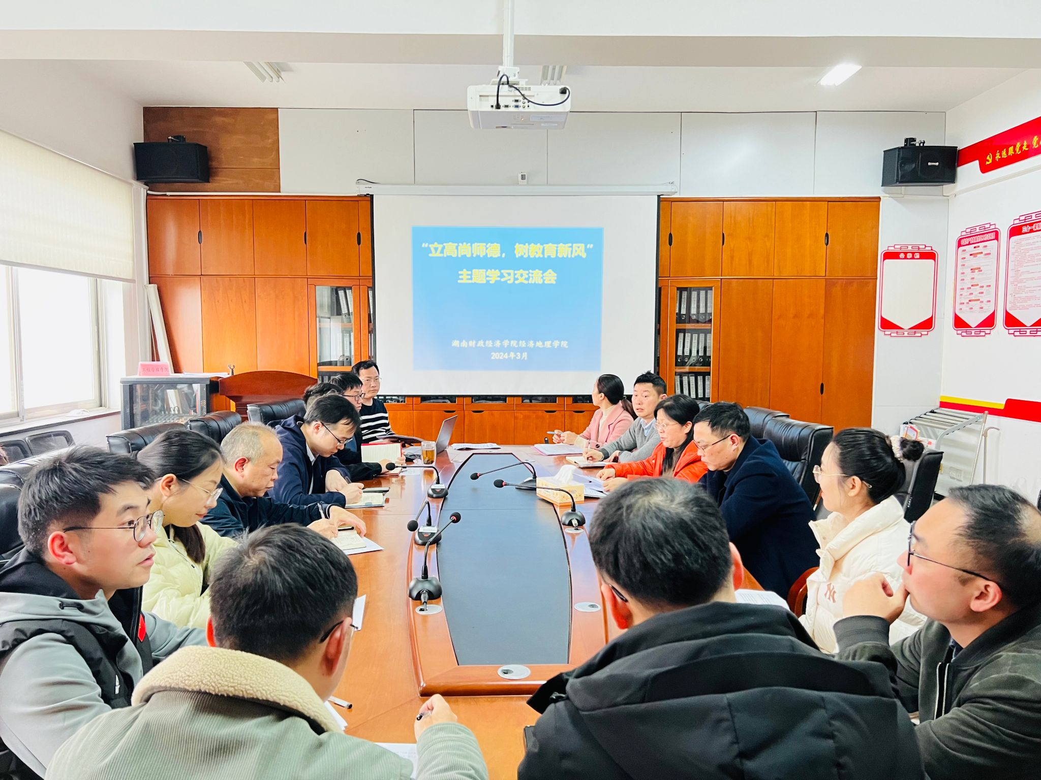 (本网讯)为加强师德师风建设,培养高素质教师队伍,进一步引导广大教职工坚定理想信念、涵养高尚师德,争做人格清朗的“四有好老师”,3月13日下午,经济地理学院在行政楼911会议室组织召开“立高尚师德,书教育新风”主题学习交流会。院直属党支部书记姚旭辉主持,学院领导班子、全体教职工参加会议。