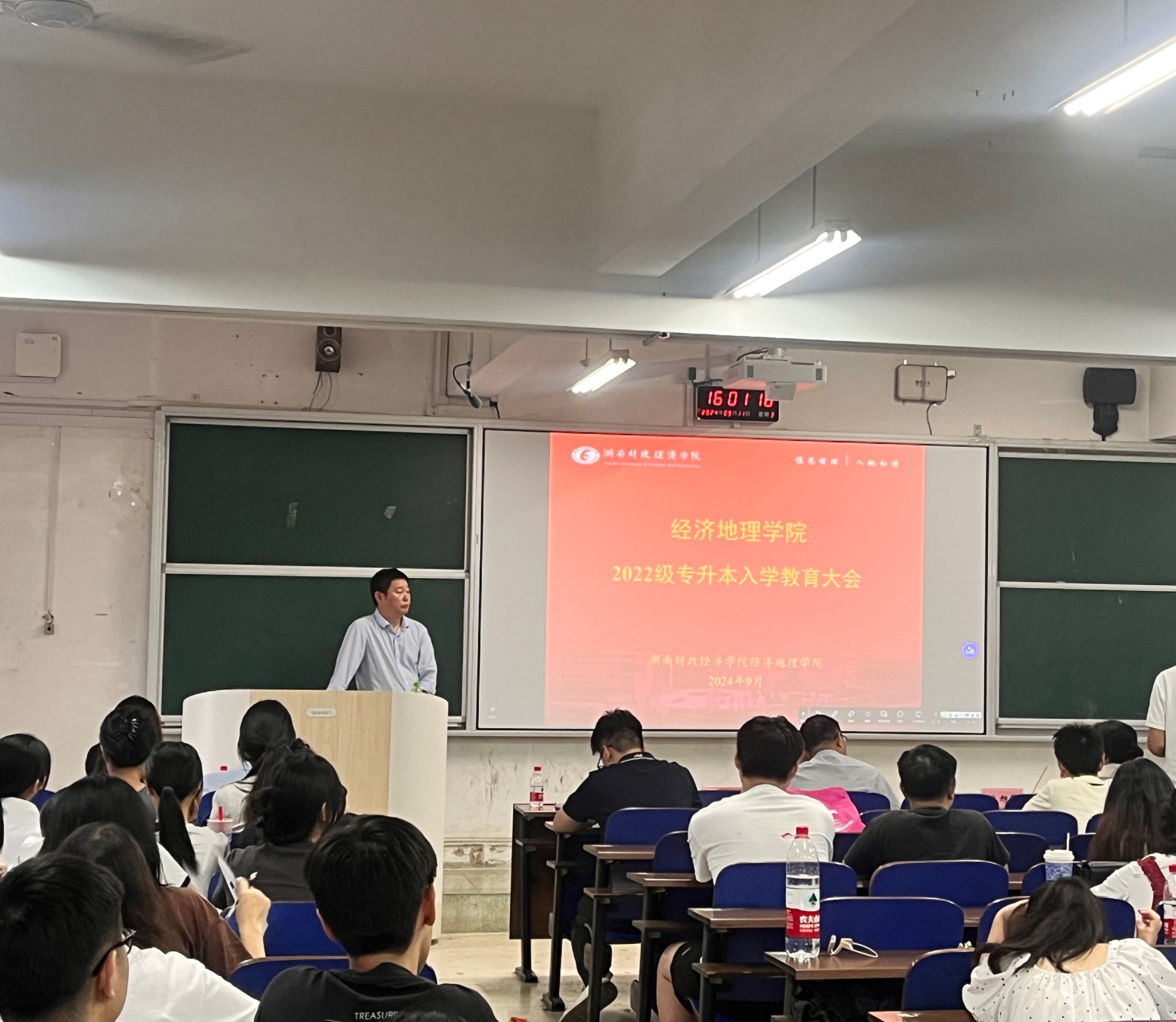 (本网讯)9月11日下午,经济地理学院在主校区3208教室召开2022级专升本入学教育大会。本次会议由副院长苏昌贵主持,院长彭文斌、院直属党支部书记姚旭辉、学院各科室负责人、系主任、新生班辅导员及2022级专升本全体新生参与会议。