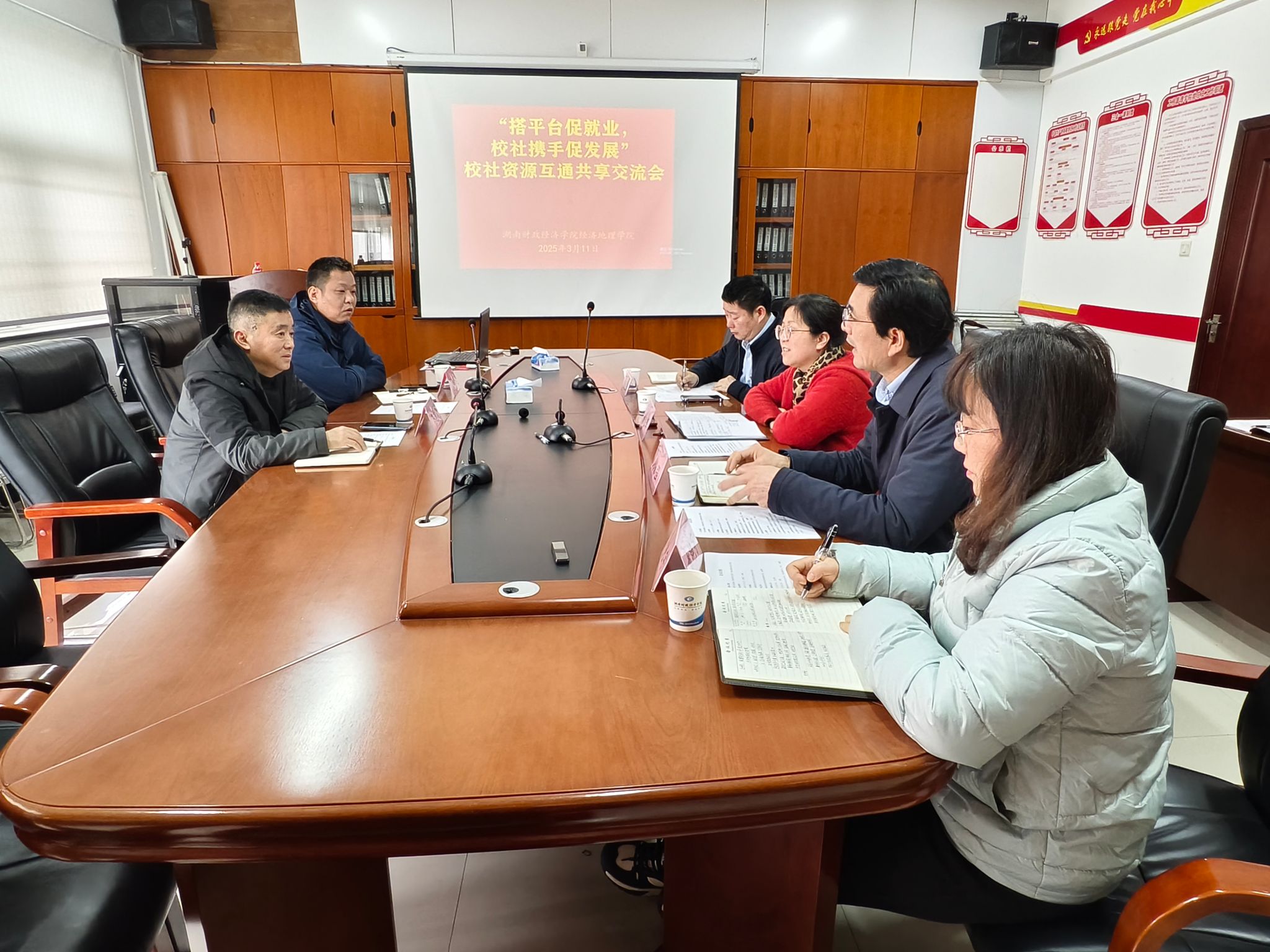 (本网讯)3月11日下午,Beat365与西大门社区在学院主校区行政楼911会议室联合举办了以“搭平台促就业,校社携手促发展”为主题的校社资源互通共享交流会。Beat365就业创业中心(校友联络中心)主任刘振强、经济地理学院直属党支部书记姚旭辉、副院长苏昌贵与咸嘉湖街道西大门社区委员会党委书记冯志峰、主任彭凯就挖掘岗位资源,探讨校社合作新模式,共同商讨毕业生招聘会与促进就业事宜。