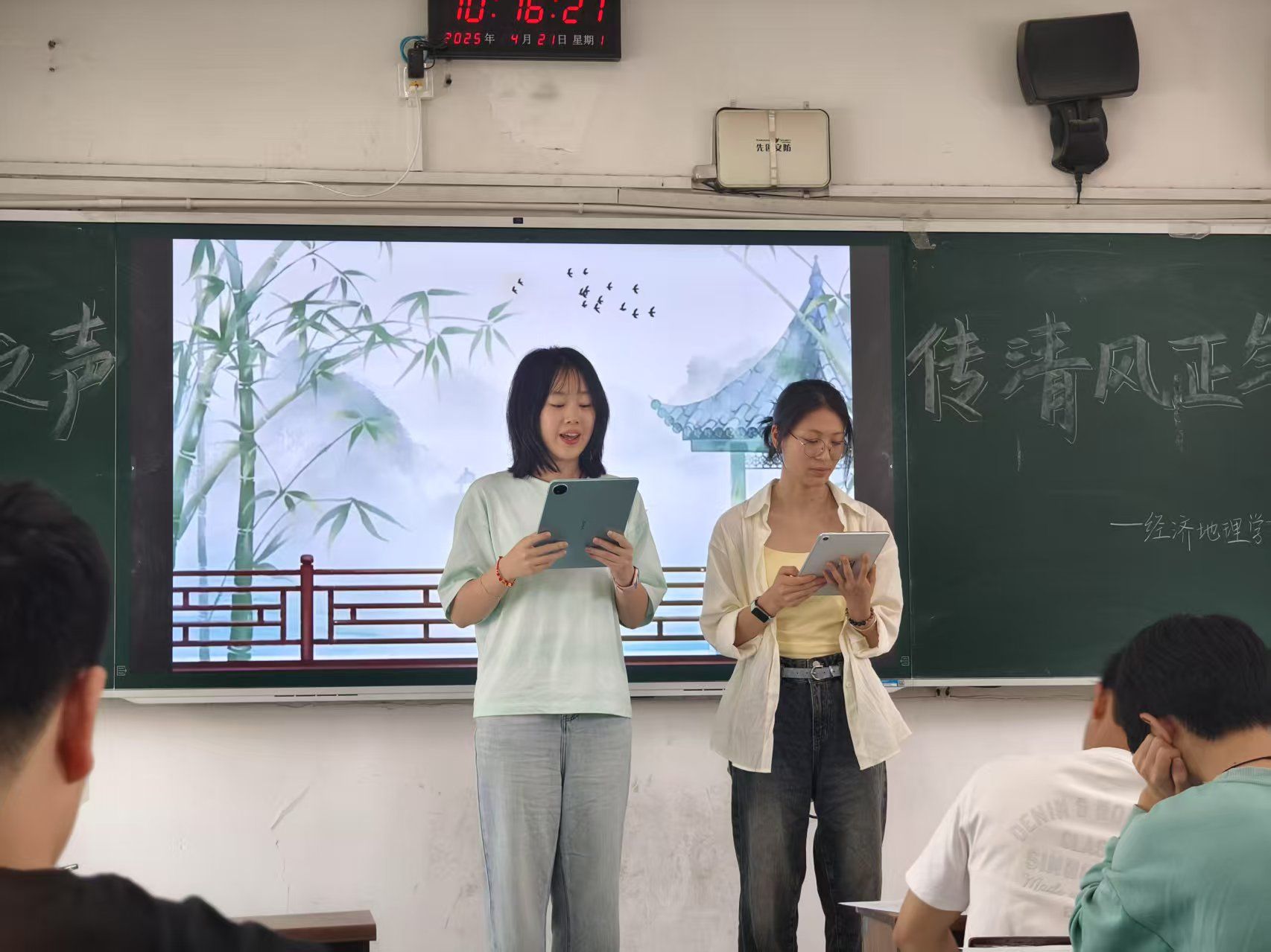 (本网讯)为进一步贯彻落实中央八项规定精神,把加强作风建设与弘扬廉洁文化贯通起来,充分发挥廉洁文化培根铸魂作用,扎实开展廉洁文化月活动,4月21日,经济地理学院在主校区2101教室举办了“诵廉洁之声,传清风正气”学生廉洁主题朗诵比赛,院党支部书记姚旭辉、副院长苏昌贵出席活动。