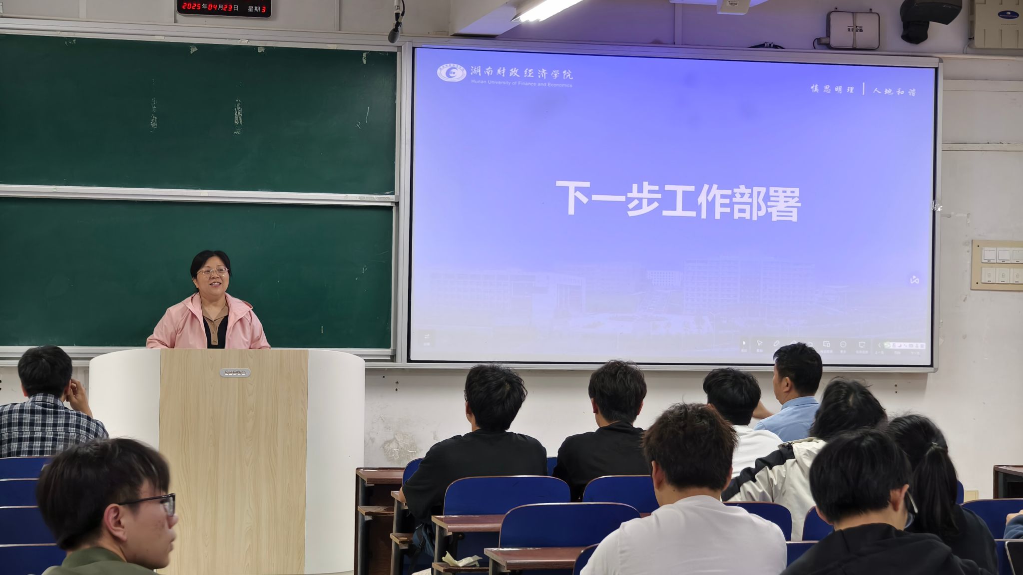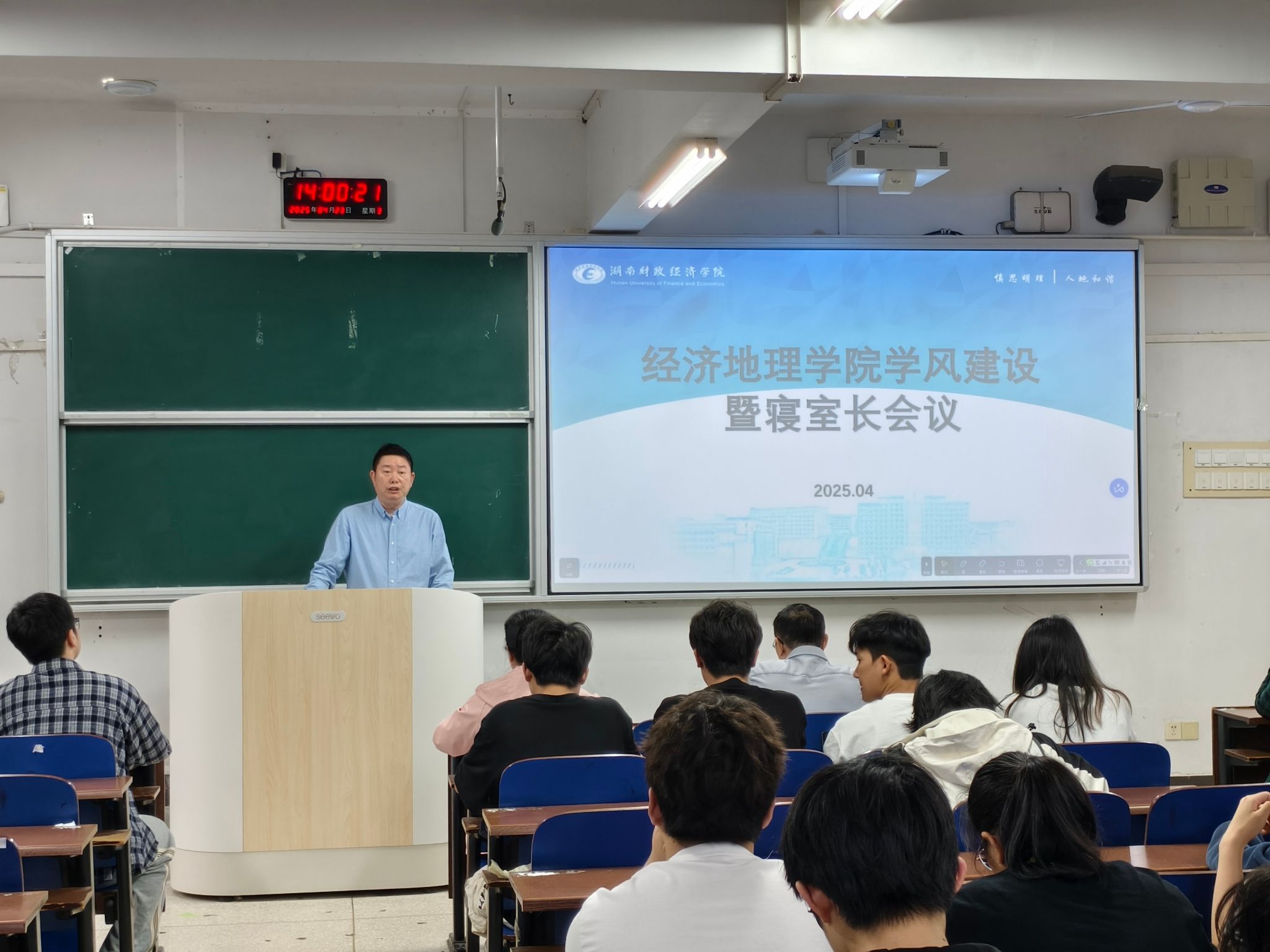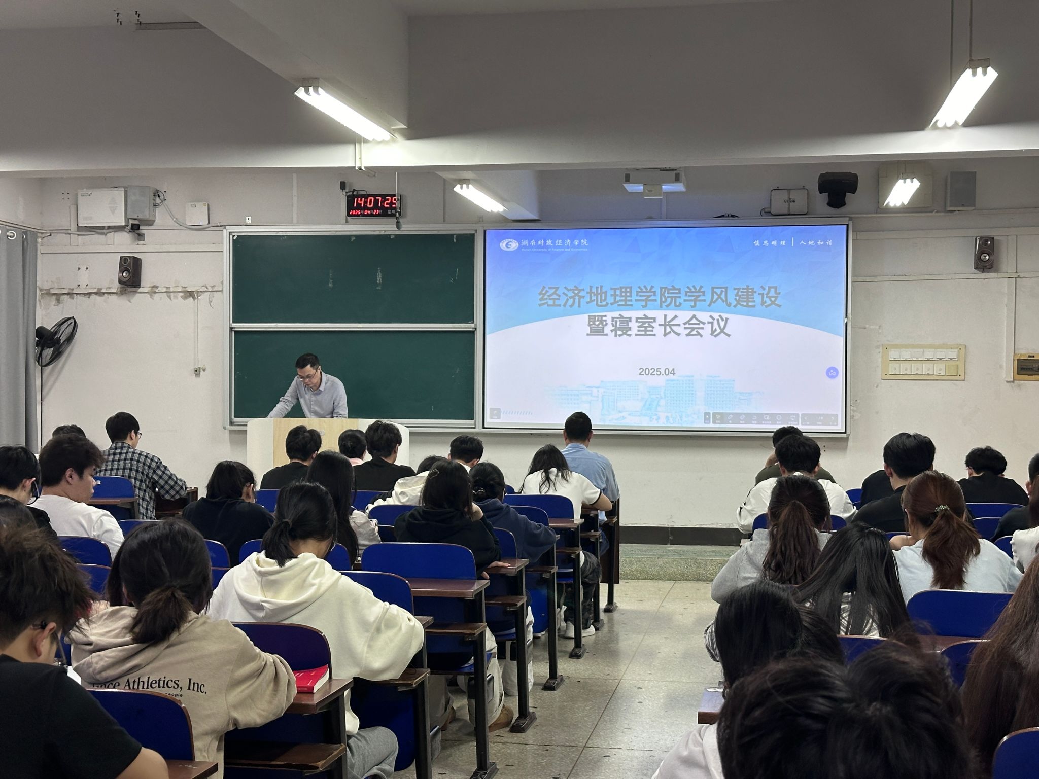 (本网讯)为进一步加强学院学风建设,营造乐学、好学、勤学的宿舍文化氛围,4月23日下午两点,经济地理学院在主校区3101教室召开学风建设专题暨寝室长会议。院直属党支部书记姚旭辉、院长彭文斌、副院长苏昌贵,团总支书记、全体辅导员及各年级学生寝室长参会,会议由苏昌贵主持。