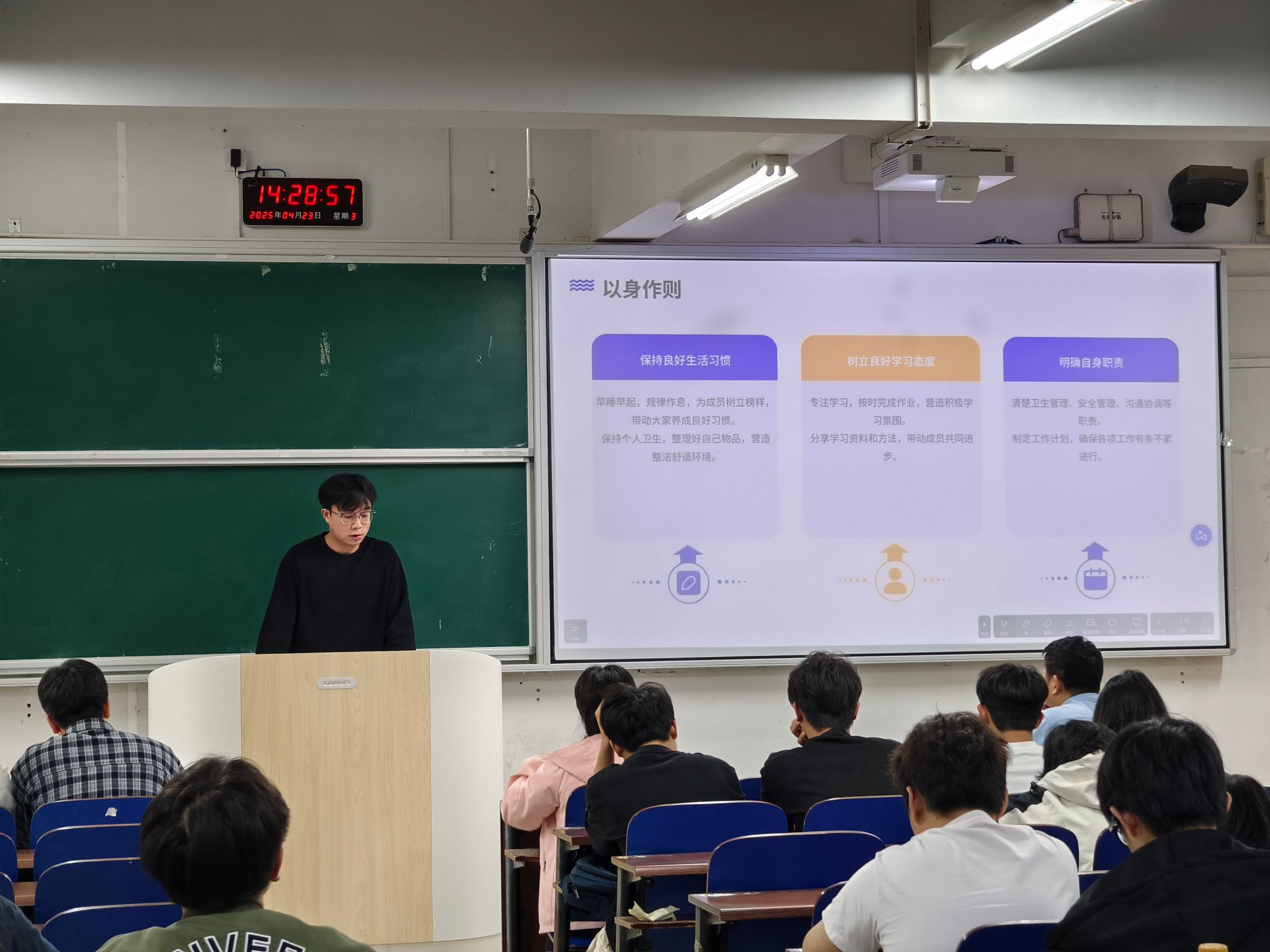 会上,彭文斌对辅导员和学生寝室长一直以来为同学们默默付出、积极服务的奉献精神表达了高度认可与诚挚感谢。他指出,学风建设是关系着学生成长成才、学院高质量发展的长远大计,要常抓不懈,全院上下要形成“教书育人、管理育人、服务育人”的工作合力;寝室是学生生活的最小单元,寝室长作为宿舍管理的“第一责任人”,要强化责任意识,提升服务能力,发挥示范作用,认真履职,以身作则,在工作中锻炼和提高自身的能力和素质,让寝室成为同学们生活学习的安全温暖港湾。他殷切期望同学们讲究团队合作,相互监督,相互包容,乐于奉献,共同努力,将会议精神转化为实际行动,落实到日常学习和生活中,共同营造“比学赶超”的良好氛围。
