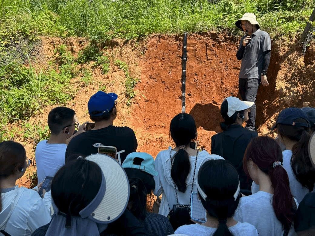 垂直诗篇:海拔梯度中土壤带谱的驱动因素揭秘。自然地理实习队在大围山南门上坡位置,欧阳宁相、张鹏博两位老师结合实地场景系统讲解了典型红壤的形成奥秘:海拔500米以下的红壤由花岗岩风化物在亚热带湿热气候下经脱硅富铝化、有机质积累及黏化作用形成,具有A-B-C剖面结构,其中B层因铁铝氧化物富集呈现红棕色黏重特征;其形成是常绿阔叶林加速风化、湿热气候强化化学作用与深厚花岗岩风化壳提供酸性母质共同作用的结果。通过实地观察与理论结合,同学们直观理解了土壤发育过程及气候-植被-母质间的紧密关联,深化了对“自然要素协同作用”的认知,为后续地质与生态研究奠定了实践基础。
