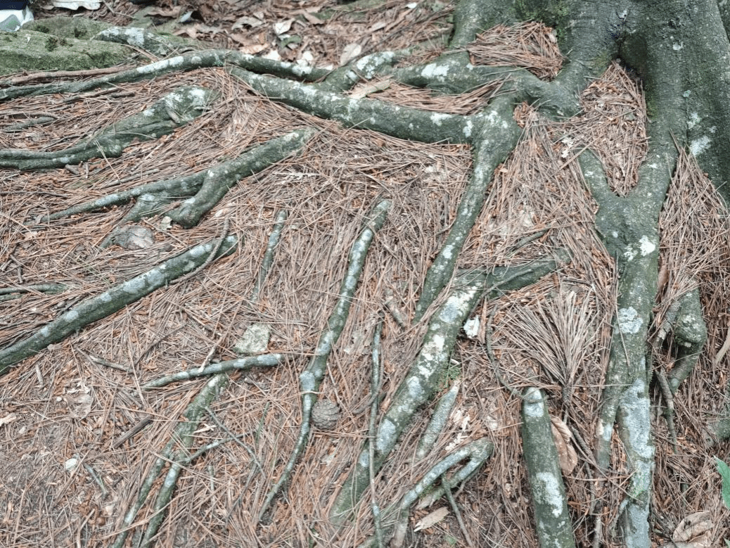 走进船底窝景区,团队聚焦于林下侵蚀现象。郭彬斌老师讲解了这种现象的发生在于雨水穿透森林冠层后,滴落动能击溅地表土壤,沿坡面形成细沟流冲刷,造成缓慢但持续的隐蔽性土壤流失。同学们通过实地对比低海拔地区植被覆盖情况,发现林下侵蚀导致此处植被覆盖度显著低于正常水平。
