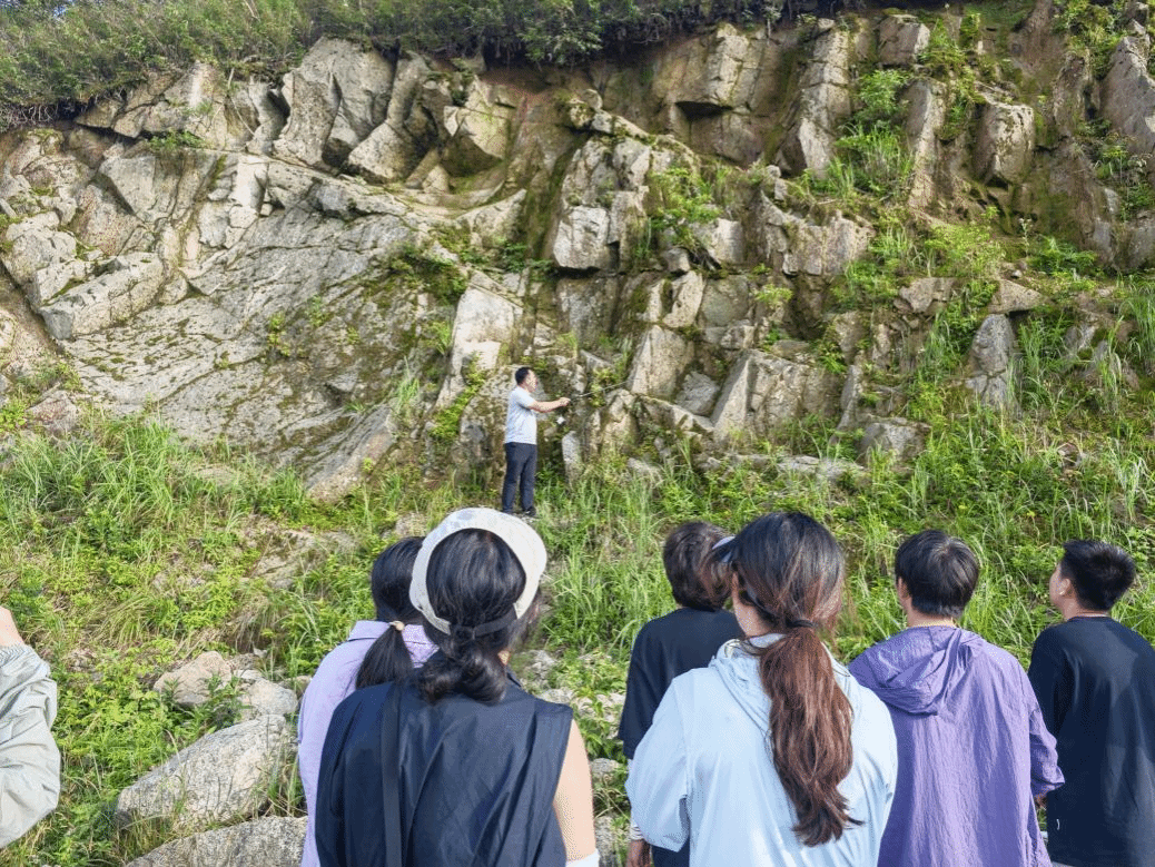 山川密码:自然要素协同下的地质地貌形成机制。大围山入口,苏昌贵副院长与陈超老师为实习队解析区域地质:地处扬子与华夏地台交界带,历经多期造山运动,主体由古老花岗闪长岩与变质岩构成。第四纪冰川侵蚀与现代流水作用叠加,形成陡峭中山地貌。苏昌贵副院长以口诀“太元古中新,震寒奥志泥石二三侏白”助记地质年代。