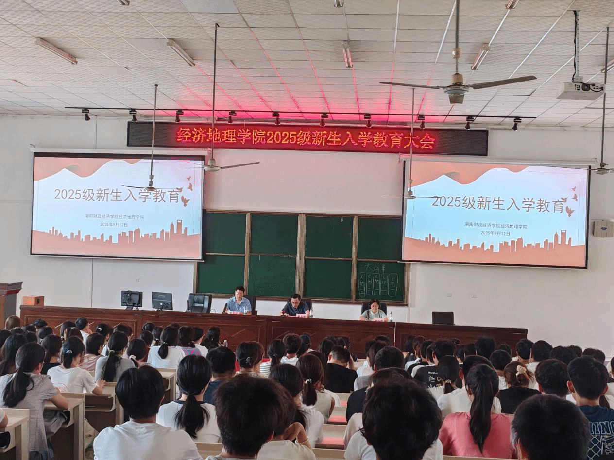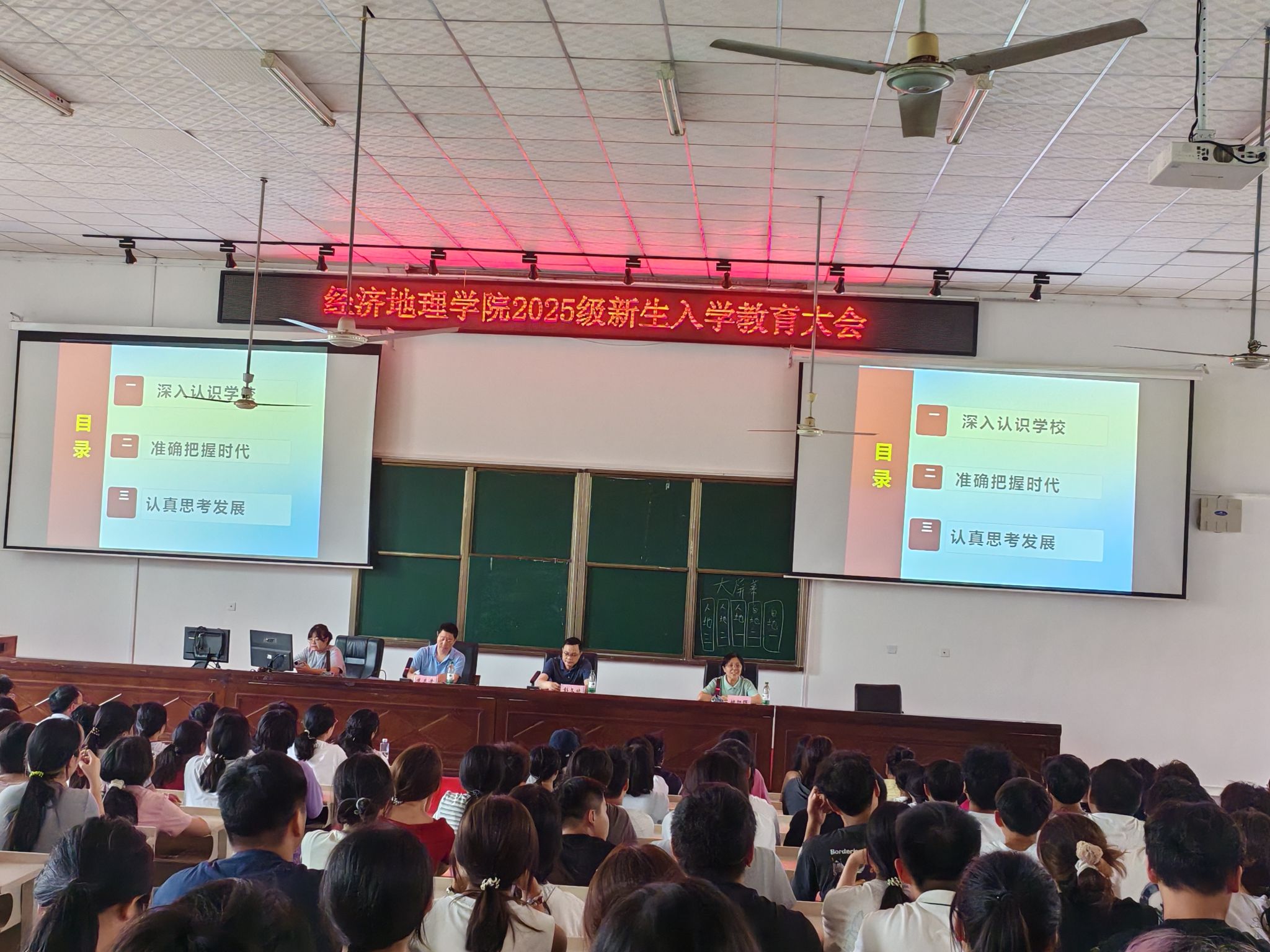 (本网讯)9月12日下午,经济地理学院在主校区第二教学楼2J01教室召开了新生入学教育大会。本次会议由学院副院长苏昌贵主持,院长彭文斌、院直属党支部书记姚旭辉、学院各科室负责人、系主任、新生班辅导员及2025级全体新生参加会议。