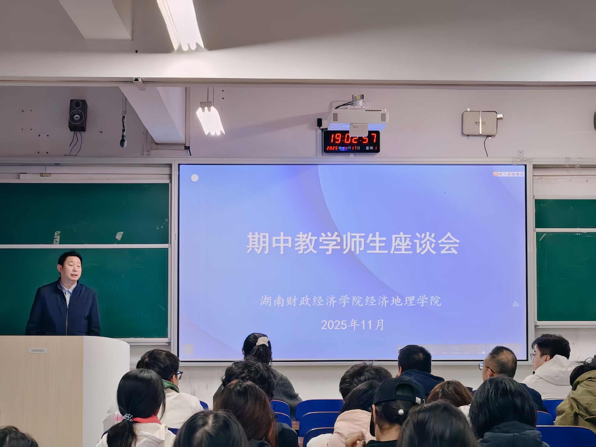 (本网讯)为精准把握教学动态、倾听学生诉求、凝聚育人合力,11月17日晚,经济地理学院期中师生座谈会在主校区三教3208教室顺利举行。学院领导、各系教师代表与各年级学生代表齐聚一堂,以“面对面”交流形式,围绕课程设置、学习体验、实践培养、毕业指导等核心议题深入沟通,共商教学提质与学生成长良策。