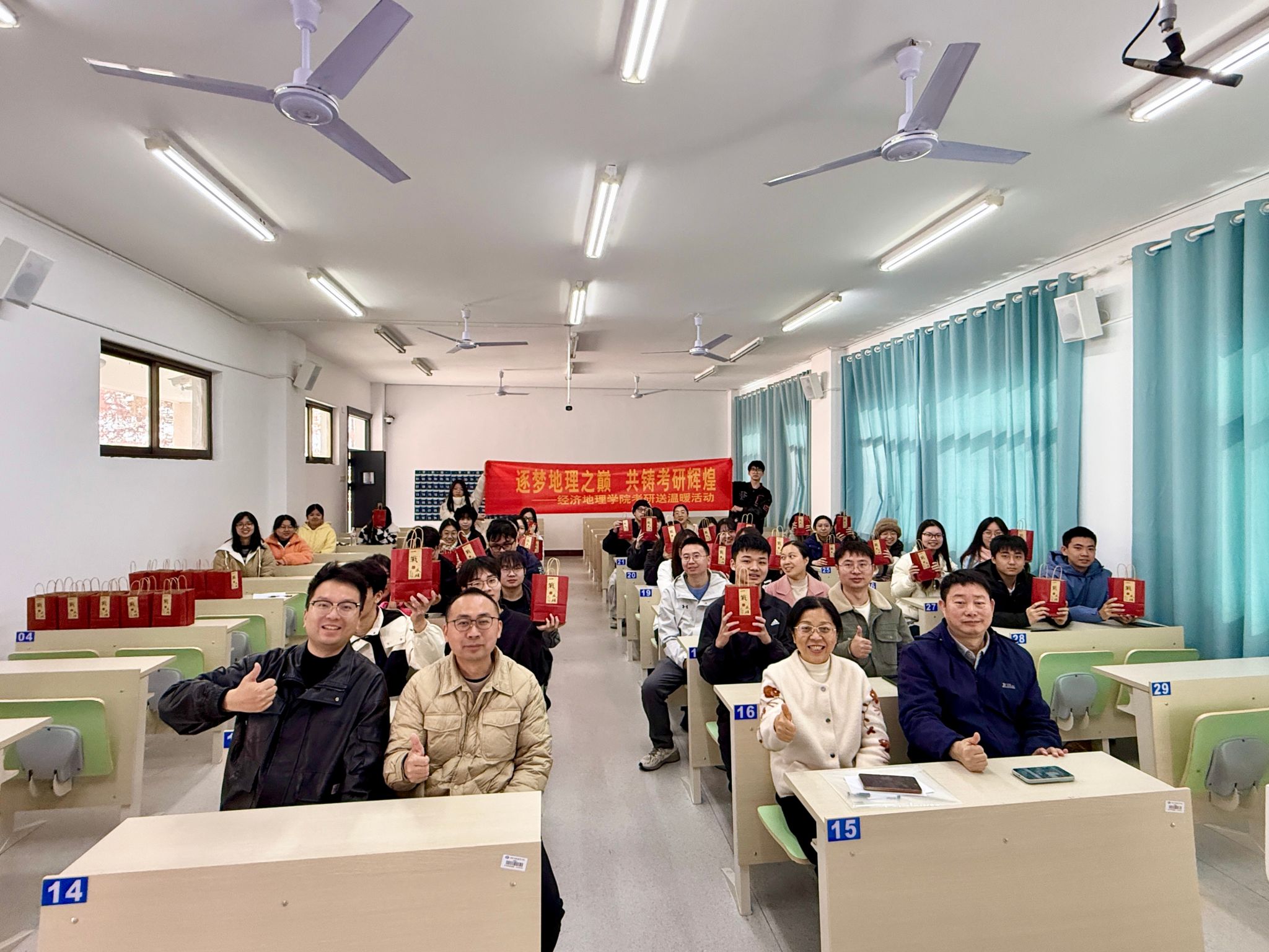 (本网讯)在2026届毕业生高质量充分就业攻坚关键期,为切实缓解考研学子备考压力、注入冲刺奋进动力,12月10日上午,经济地理学院以温馨鼓励传递关怀、以暖心举措助力逐梦,在主校区第二教学楼2311教室隆重举办考研送温暖活动。院直属党支部书记姚旭辉、院长彭文斌、副院长苏昌贵、学工办主任刘娟及毕业班辅导员刘权、教师代表应邀出席,与学子们共赴暖心之约,为追梦之路保驾护航。