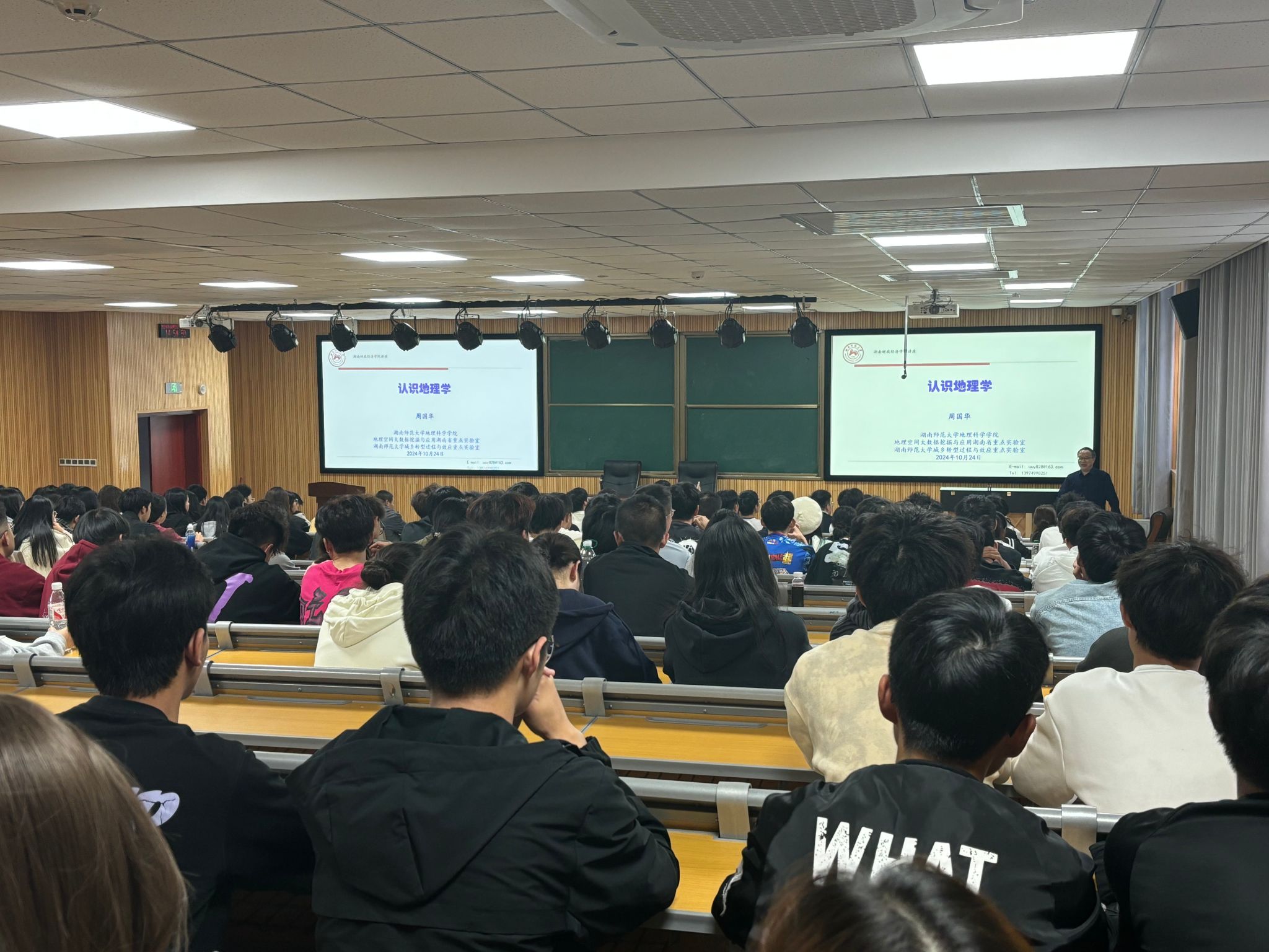 (本网讯)10月30日下午,湖南师范大学地理科学学院院长周国华教授应经济地理学院邀请来校为24级新生作《认识地理》主题讲座。讲座由经济地理学院副院长苏昌贵主持,经济地理学院学科办、教务办、两系主任以及全体24级新生200余人聆听了讲座。