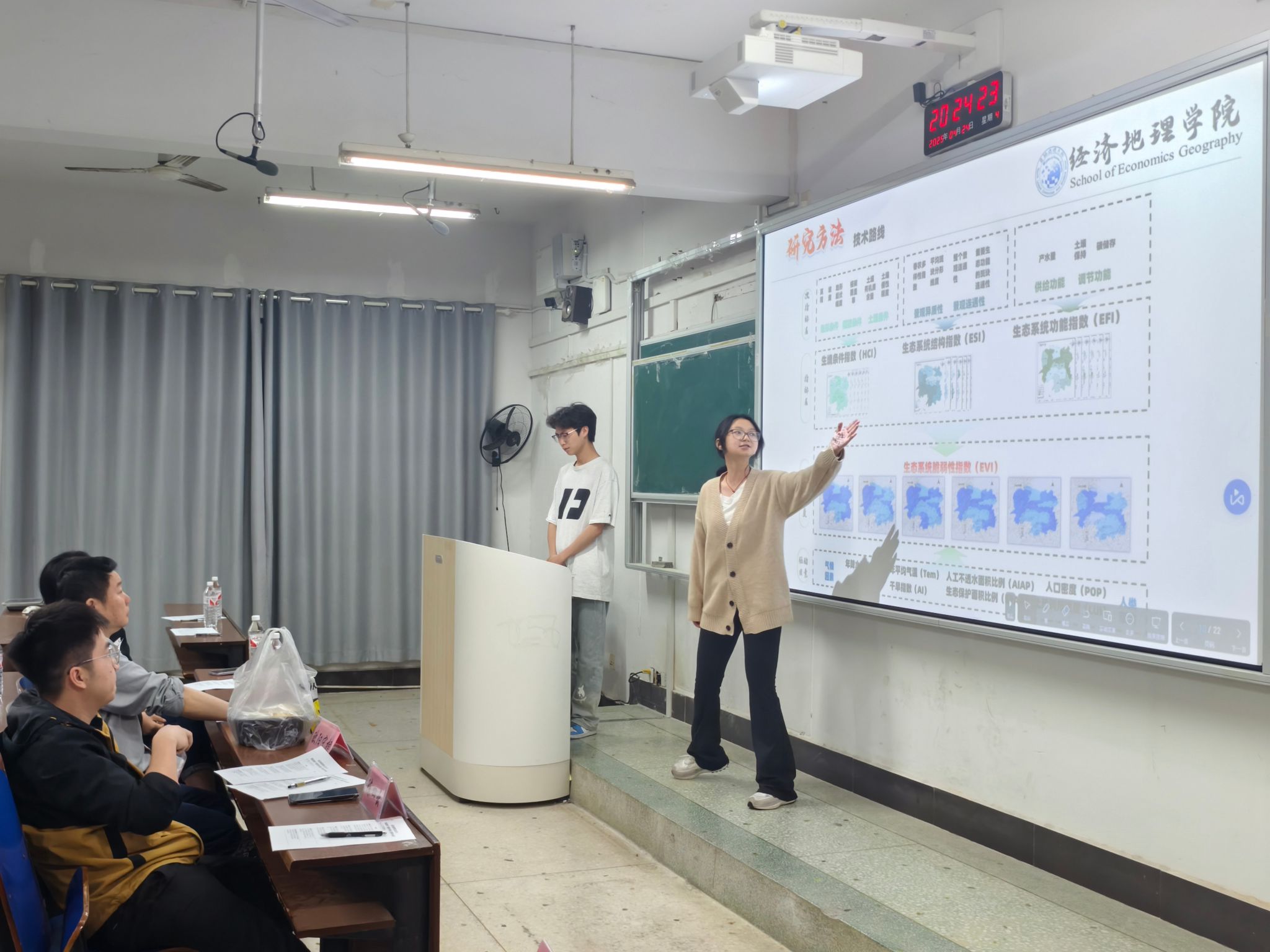 本次选拔赛由经济地理学院团学会科创部组织,邀请了我院领导和老师担任评委。经过前期自主报名,共有5支队伍参加本次选拔赛,其中自然地理方向各组围绕生态韧性、气候变化等前沿议题,人文地理方向各组围绕新质生产力与耕地系统韧性、气候变化对城市人居环境的影响、洞庭湖地区血吸虫疫情潜在风险演化等热点问题展开研究。