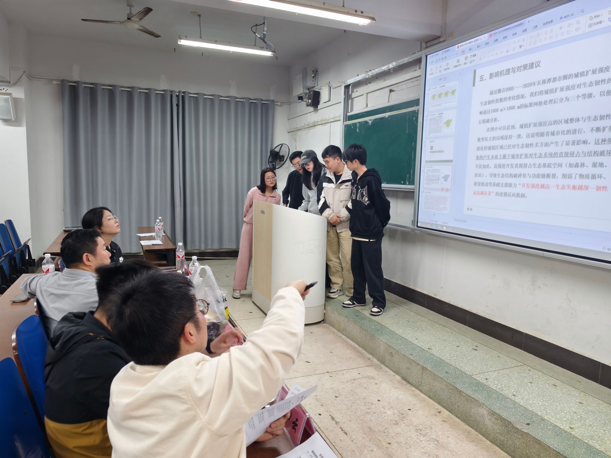 赛事采用“8分钟汇报+3分钟答辩”的赛制,评委老师从选题创新性、理论深度、方法科学性、实践价值及展示效果五个维度进行综合评分。参赛团队通过遥感影像分析、偏相关分析法、因果分析法等多元技术手段,充分展现地理学科特色,综合归纳空间规律性,系统解析机制复杂性,为推进人与自然和谐共生的现代化贡献力量。答辩环节中,评委们针对研究设计的逻辑闭环、数据处理的严谨性、技术方法可行性等提出专业建议,现场学术氛围浓厚。