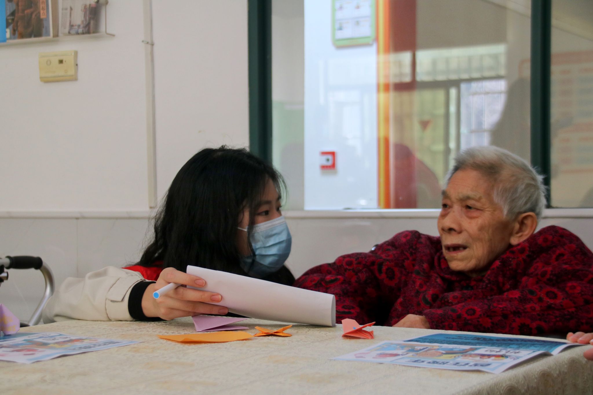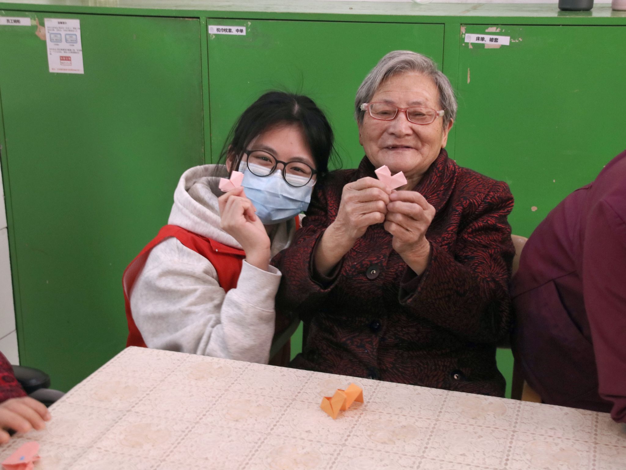 活动伊始,经济地理学院周景琪同学为老人们献上了一首经典老歌《浏阳河》,悠扬的旋律勾起了老人们的美好回忆,现场气氛温馨融洽。随后,志愿者们与老人们进行了“我与老人心换心”折纸互动环节,手把手教老人们折爱心,并将折好的爱心互相交换,寓意着心与心的连接,传递着温暖与祝福。