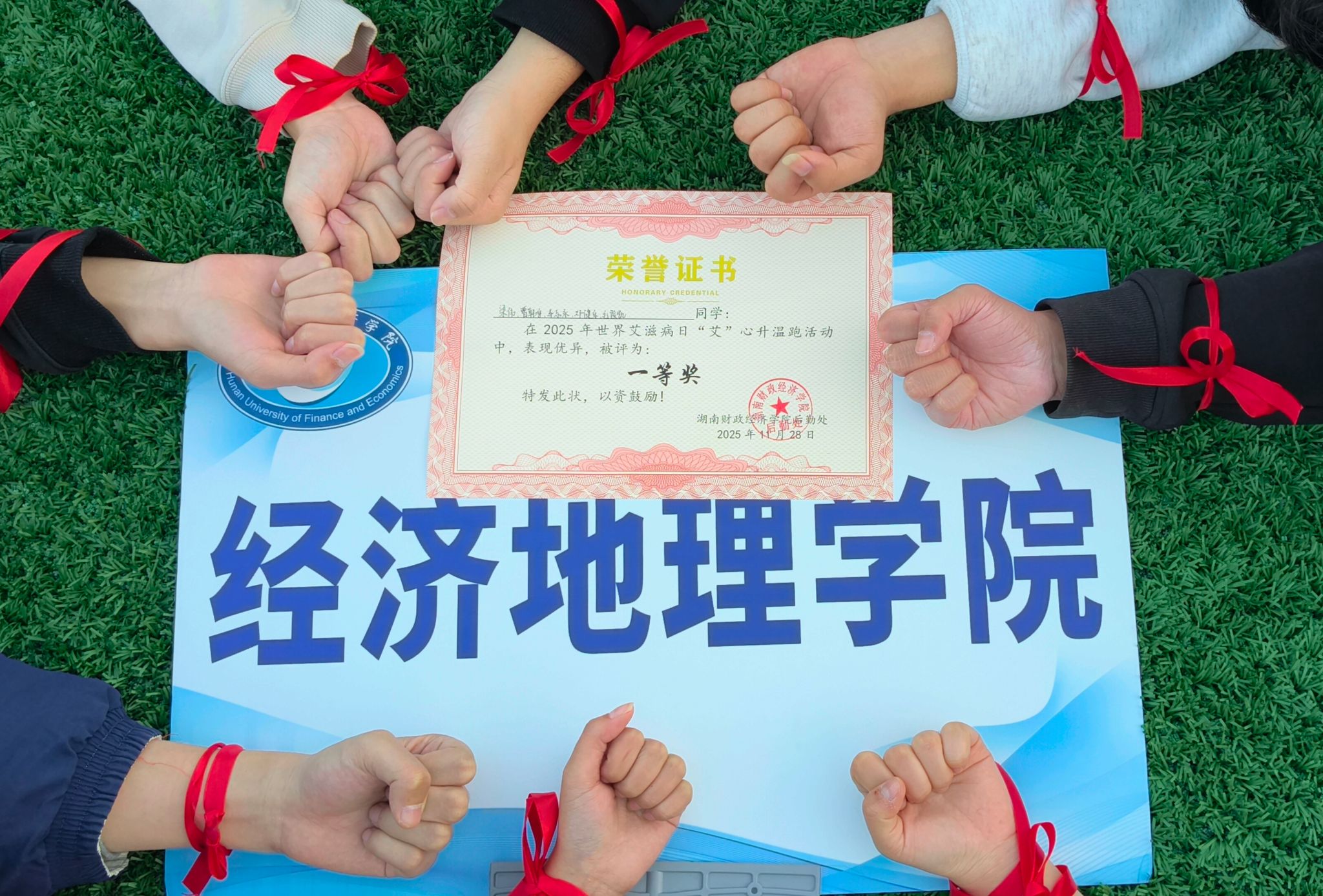 竞赛尾声,在“希望之光誓约仪式”环节中,队员们手腕系上防艾红丝带,共同宣读《防艾先锋誓约》,以庄重的承诺凝聚防艾共识。在欢笑中经地队员完成活动挑战,经过激烈角逐,经济地理学院队伍脱颖而出,收获了一等奖的好成绩,为学院荣誉榜再添一颗闪亮的新星。