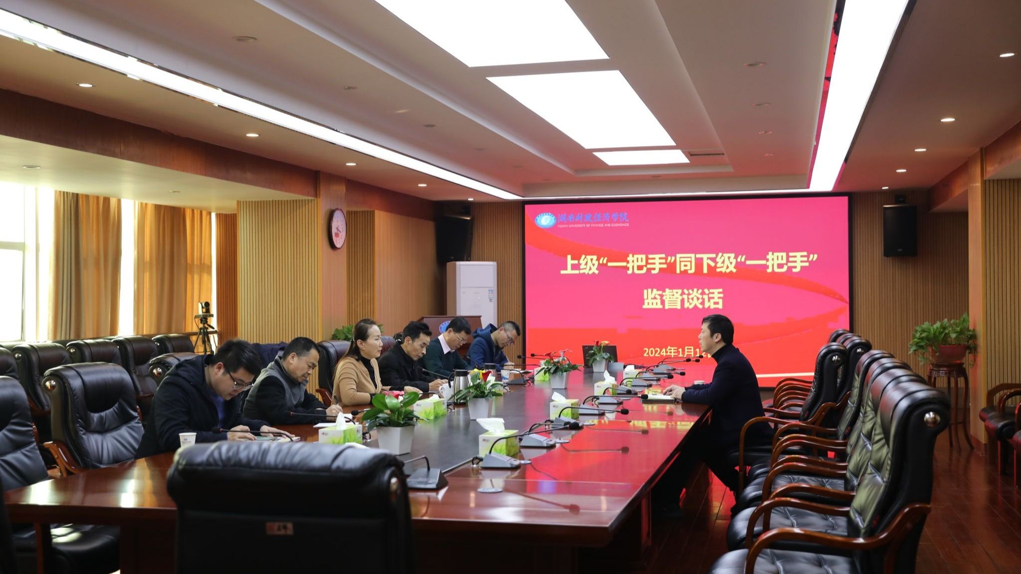为深入贯彻习近平总书记关于上级“一把手”必须抓好下级“一把手”的重要指示精神,压紧压实各二级党组织主体责任,督促二级单位“一把手”切实履行第一责任人职责。近日,受兰英书记委托,校党委副书记苏玲和纪委书记李雪山对学校各二级单位主要负责人开展了上级“一把手”同下级“一把手”的监督谈话。