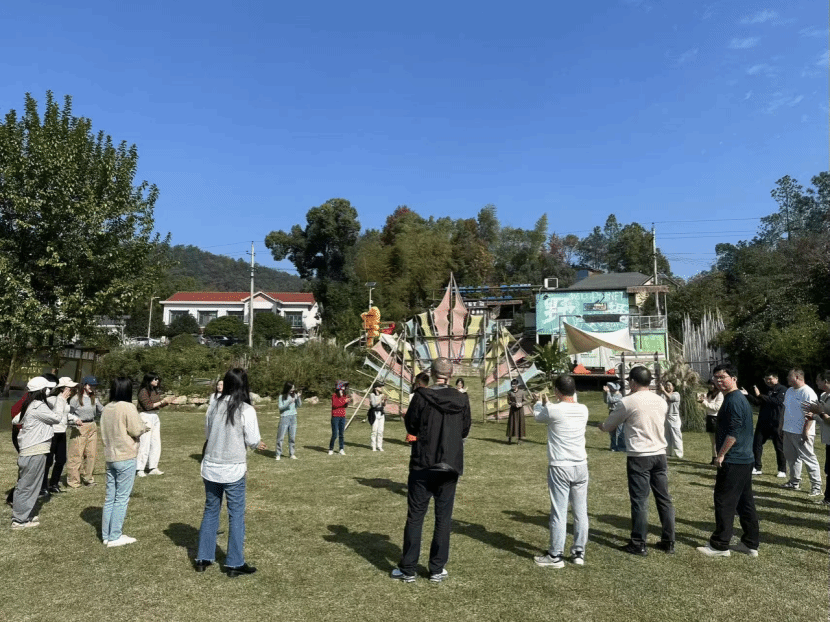午前,教师们乘车前往野趣猩球山谷营地,进行一系列素质拓展活动。气球火车游戏中,教师们通过肢体协作与沟通,强化了团队信任与节奏感;极限飞盘大赛则利用乡村老物件,让教师们体验了原汁原味的农村生活,集体拍照留念,定格了这难忘的瞬间。