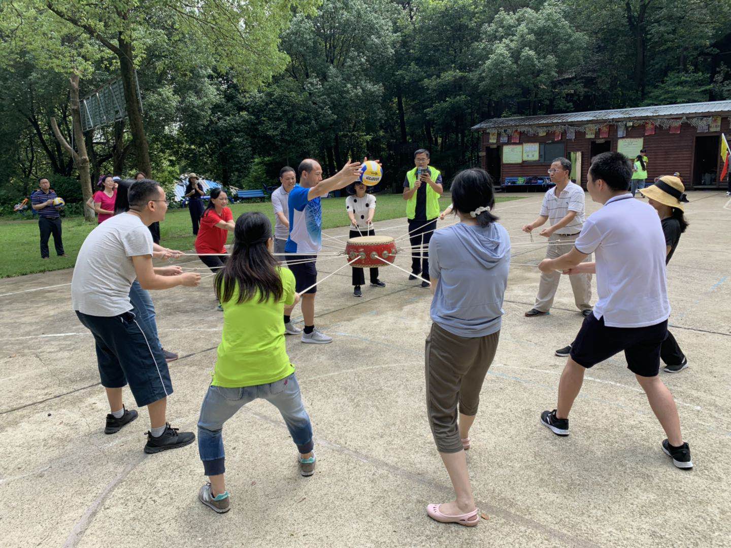 迎着初升的朝阳,教职工一行来到农庄,便开始了丰富多彩的团体素拓活动。第一项活动是“击鼓颠球”比赛,以各组队员在规定的时间内累计完成击鼓颠球的个数最多取胜。教师们分成了两组,每组选出各自信任的队长,组织队员先进行模拟演习,模拟演习后每个队员都献计献策,最后由队长总结,统一指挥、协同共进。有竞争才会有快乐才会有斗志,每位队员都尽着自己最大的努力帮助团队获胜。第二项团体活动为“神笔马良”,分组由队员一起着笔写字,尽管烈日当空,但是他们斗志不减,表演出色,两队分别合作出色地完成了书写作品。随后我们还进行了爬山、乒乓球、KTV棋牌等文体活动。
