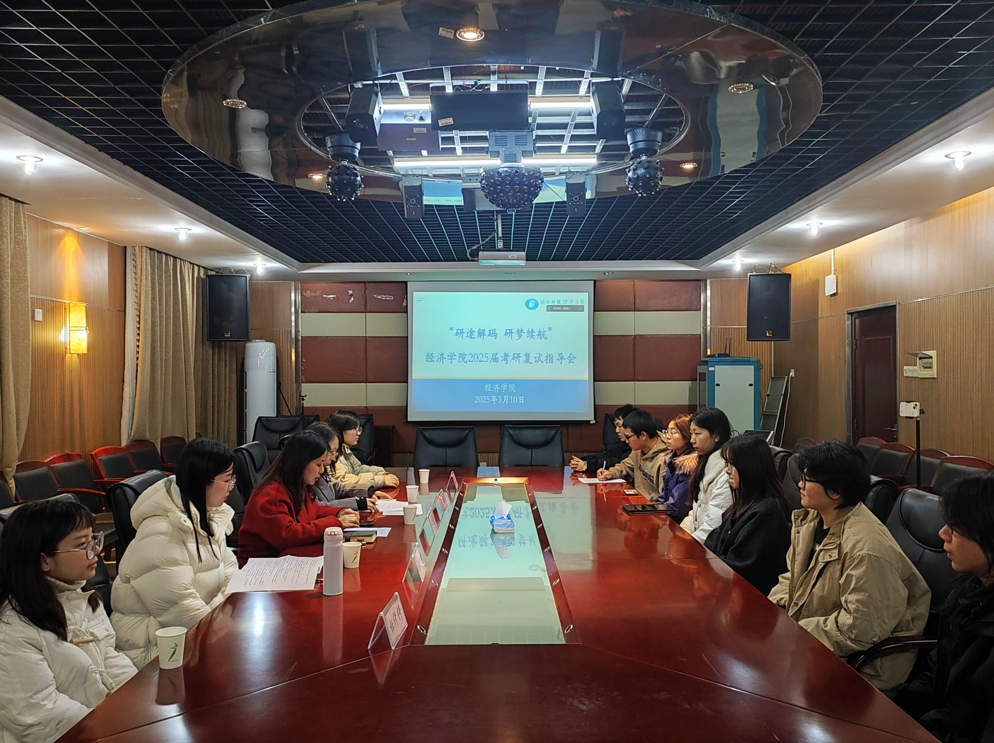 (本网讯)为帮助2025届考研学生更好熟悉复试流程、掌握复试技巧、增强备考信心,3月10日晚,经济学院在办公楼1014会议室开展“研途解码•研梦续航”2025届考研复试指导会。经济学院副院长陈雯、党委副书记刘英、教师代表彭思倩及4名研究生学长学姐进行复试经验分享与交流,2025届考研上线学生参会。