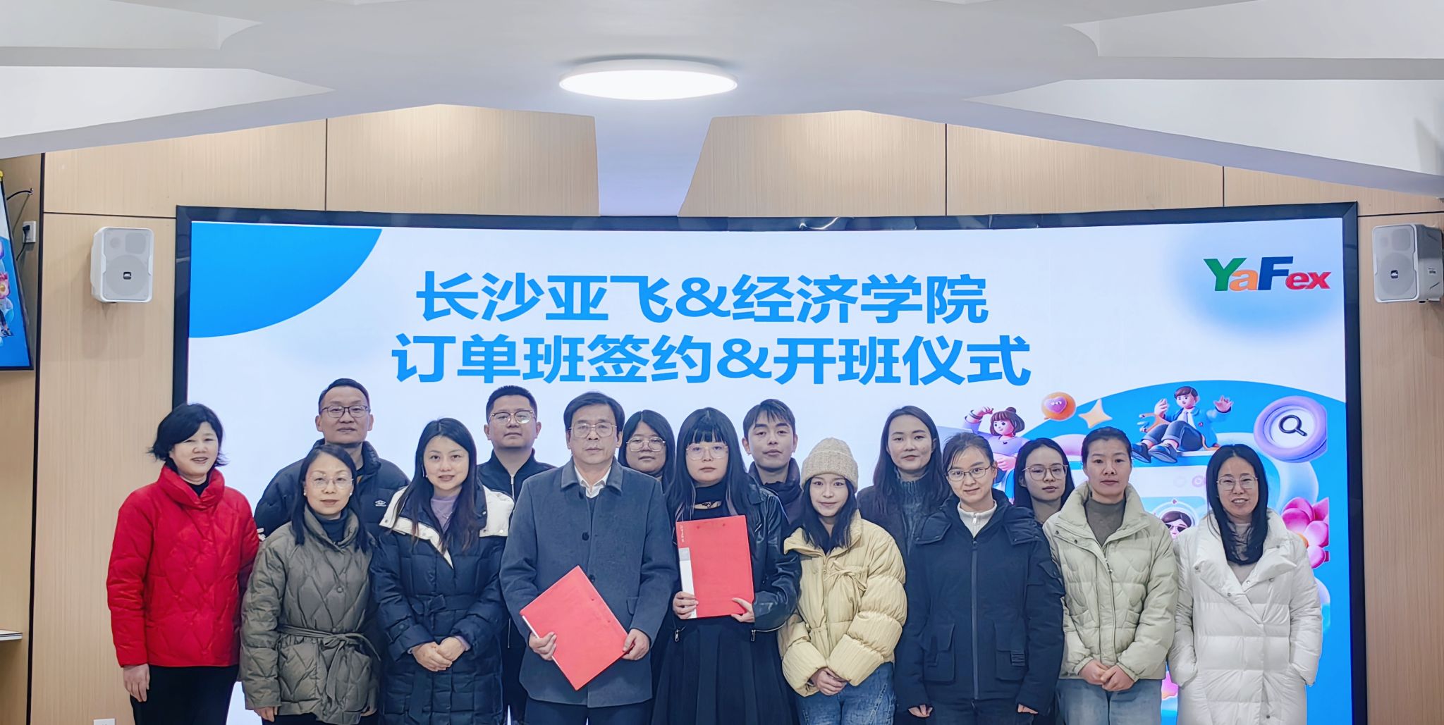 (本网讯)1月5日下午,长沙市亚飞科技有限公司与Beat365唯一官方网站经济学院合作开展的“跨境电商订单班”签约暨开班仪式在湖南财政经济学院数智商科实验室举行。这是经济学院面向2026届毕业生举办的第二期订单班,通过校企深度合作,共同培养适应跨境电商发展需求的高素质应用型人才。经济学院院长李勇辉、副院长陈雯、副书记刘英、系主任张扬、就业专干谢龙、专任教师姚志毅、姚娟,长沙市亚飞科技有限公司经理李方玉和四位企业导师共同出席仪式。