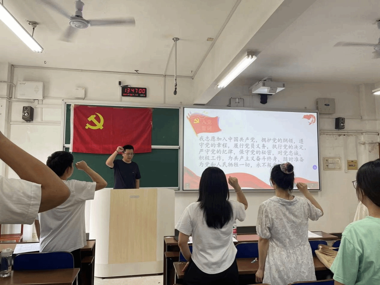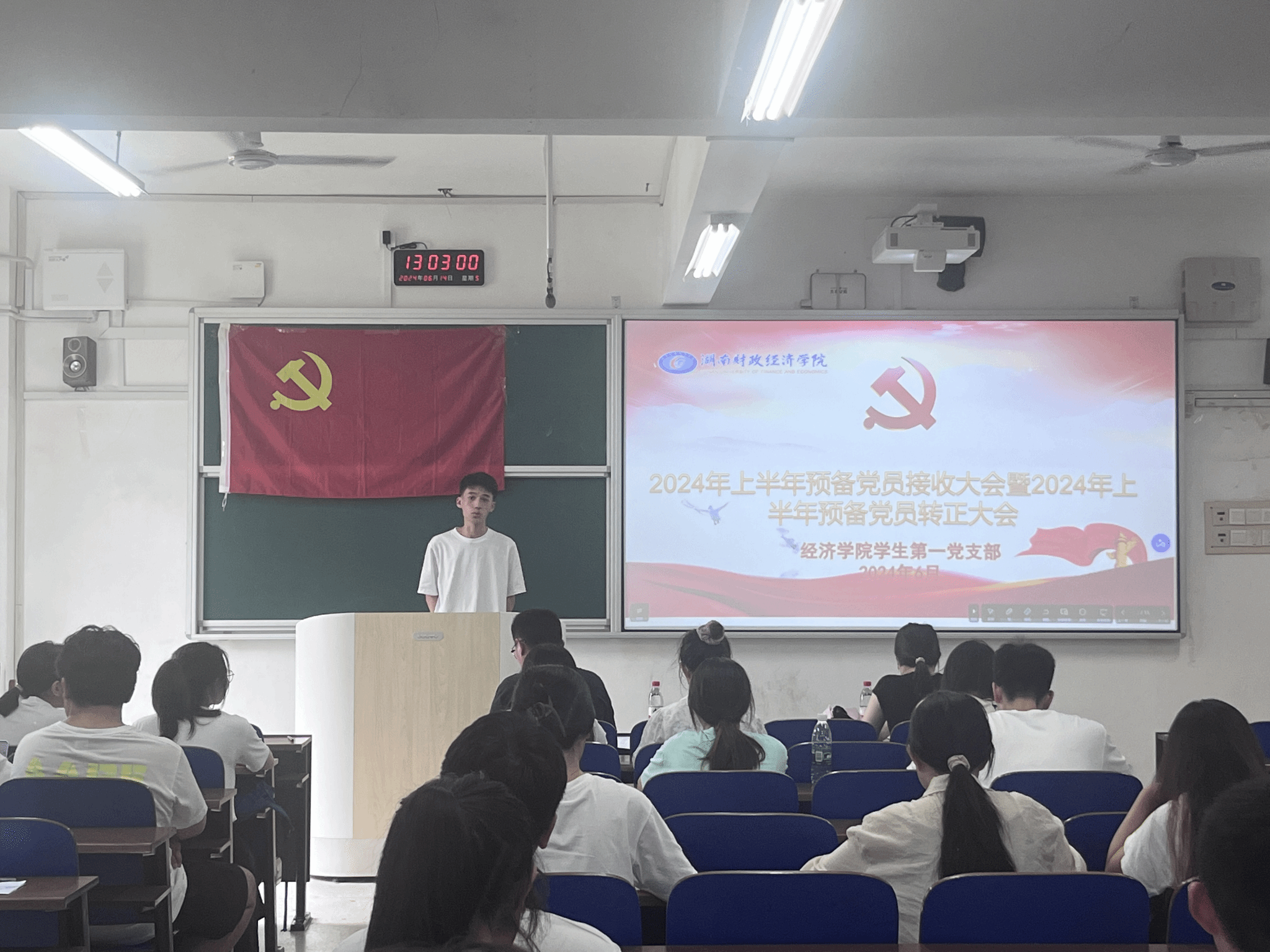 (本网讯)6月14日,经济学院学生第一党支部于3313教室召开了2024年上半年预备党员接收大会暨预备党员转正大会。经济学院党委书记余华、党委副书记刘英出席本次会议,支部书记谢龙主持,支部全体党员及6位发展对象参会。