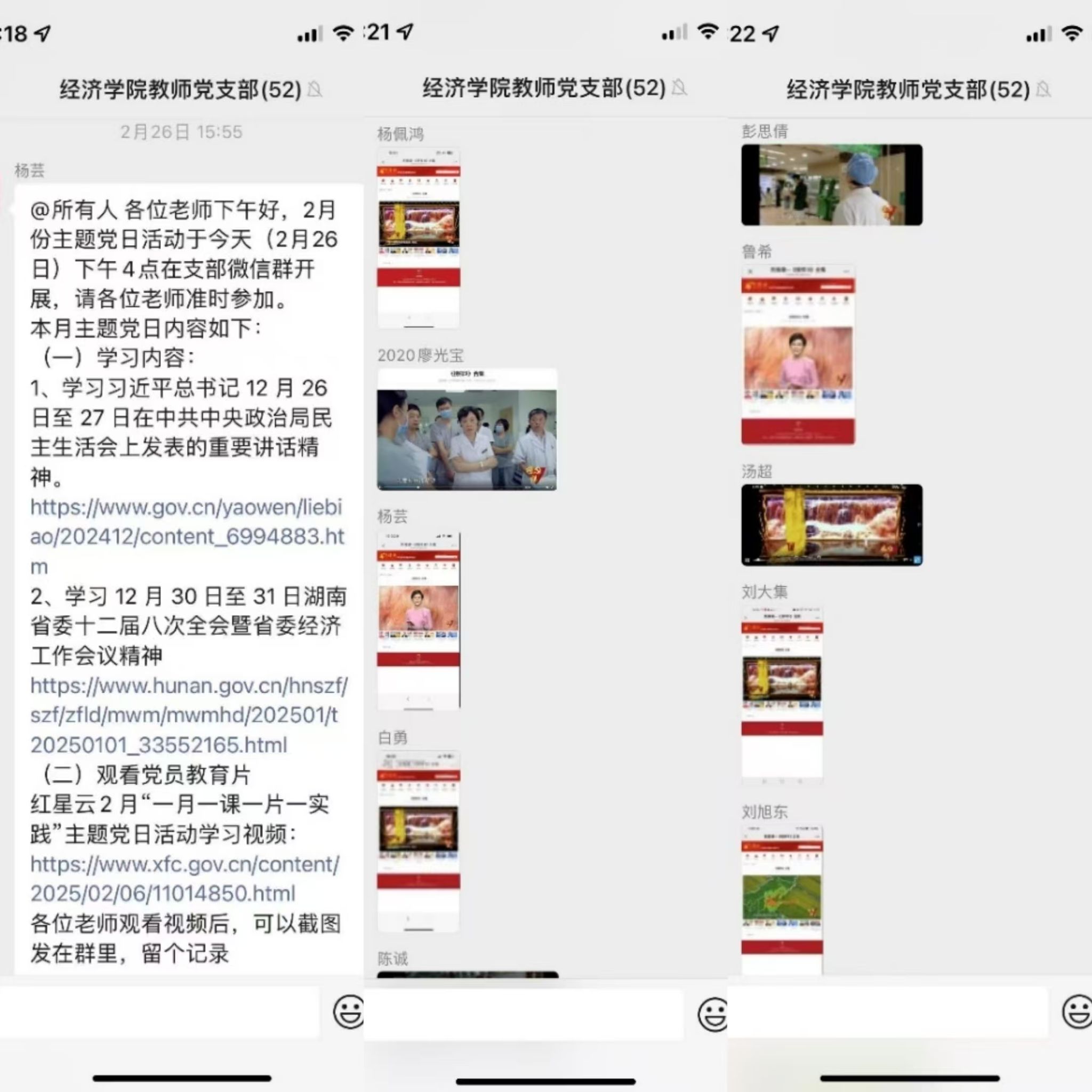 (本网讯)2月26日下午4时,经济学院教师党支部通过微信群平台,线上举办了以“凝心聚力开新局 奋楫扬帆谱新篇”为主题的党日活动。本次活动由支部书记杨芸同志主持,全体教师党员积极参与,共同学习交流。