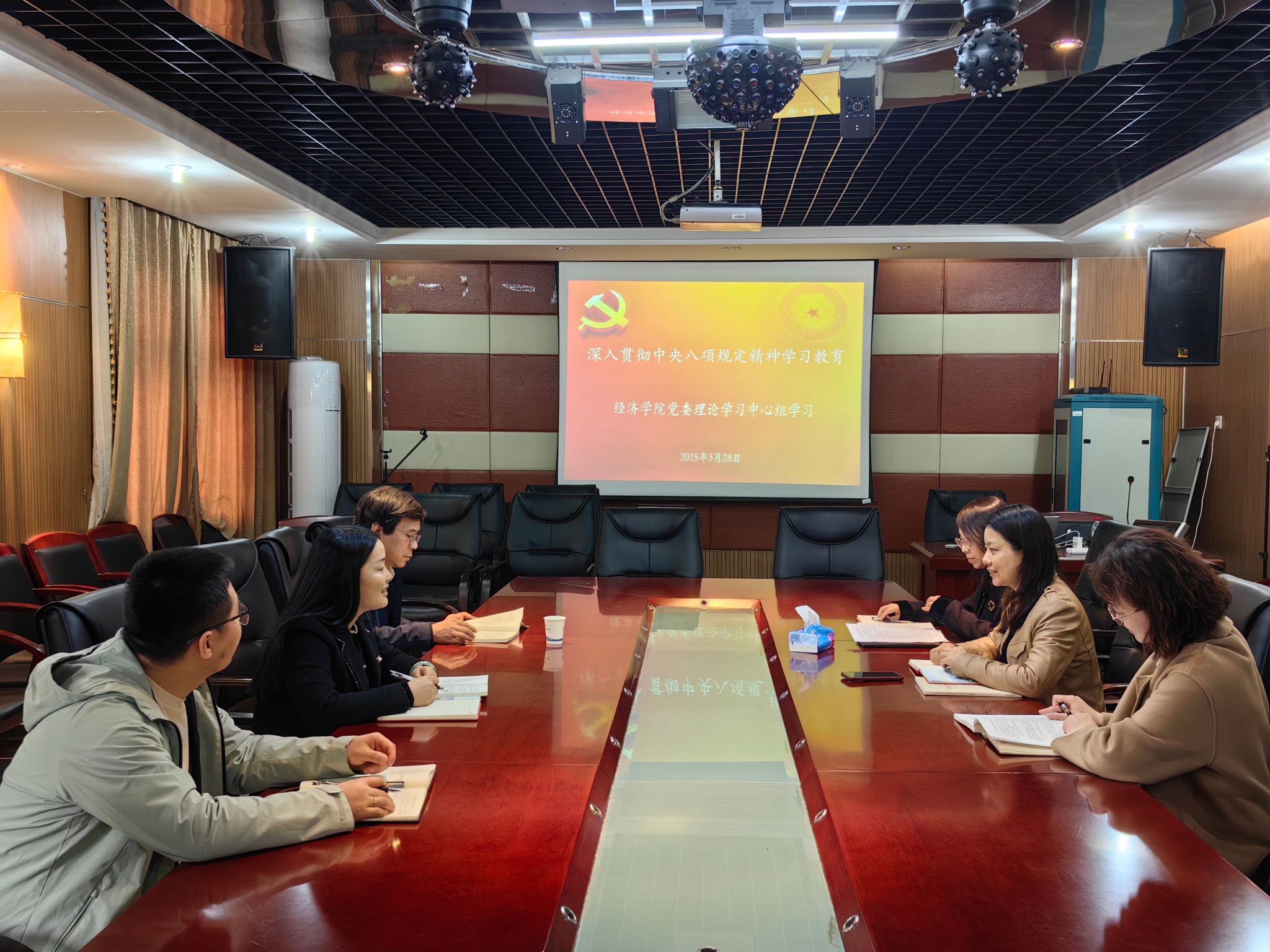 (本网讯)3月28日上午,经济学院党委理论学习中心组在会议室1014举办深入贯彻中央八项规定精神学习教育专题学习,学习领会习近平总书记关于加强党的作风建设的重要论述和中央八项规定及其实施细则精神,并布置学习教育重点任务。会议由院党委书记余华主持。