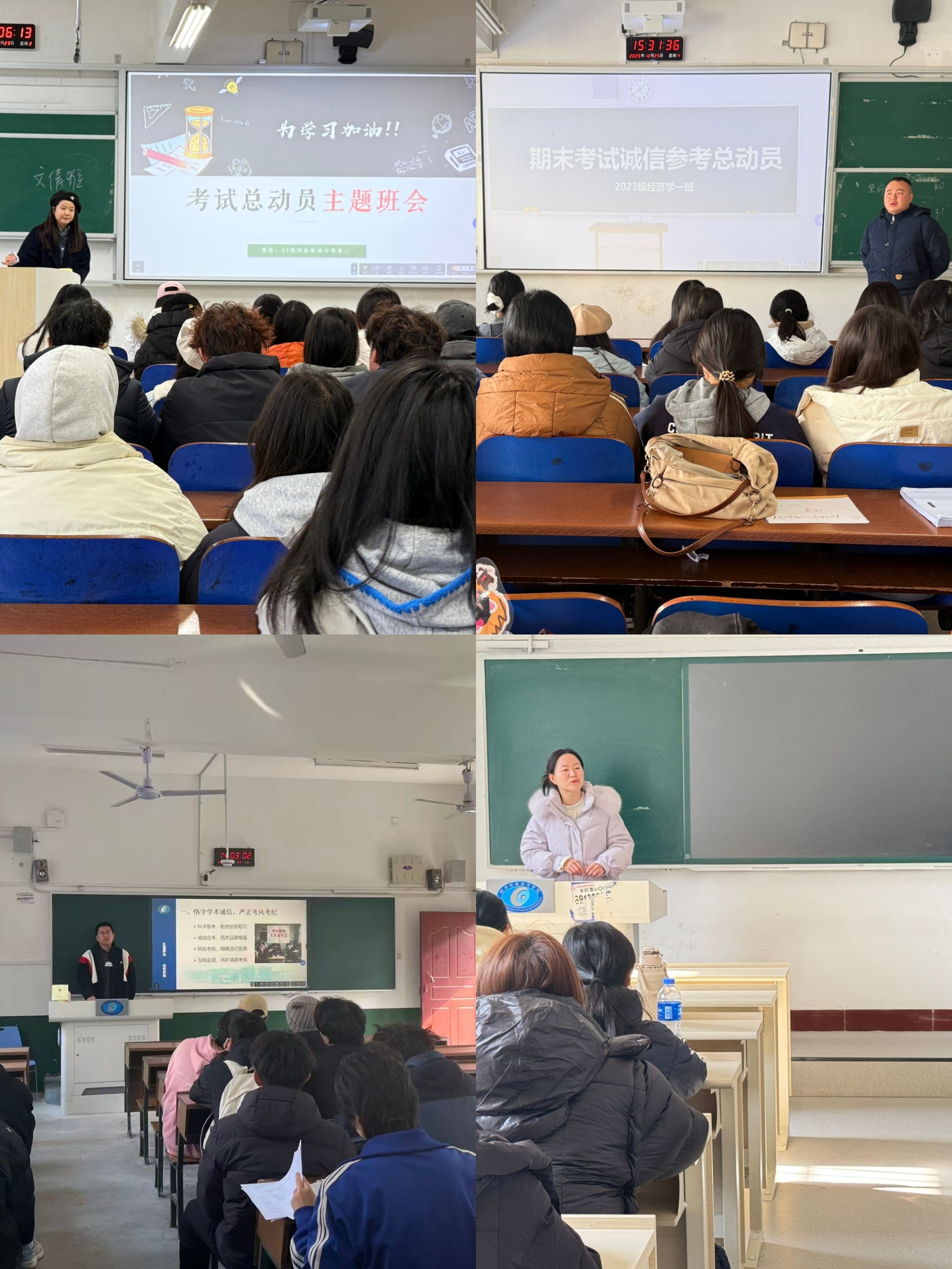 (本网讯)期末将至,为铸牢学风考风防线,强化学生诚信应考与安全防护意识,经济学院各班级近期陆续召开期末主题班会。系列班会由辅导员与班主任共同主持,以“强学风、严考风”为核心,涵盖考前复习指导、考试纪律、心理疏导、诚信教育及各类安全教育等关键内容,明确学生党员干部模范带头要求,通过双师齐抓共管,为期末工作平稳推进铸牢基础。
