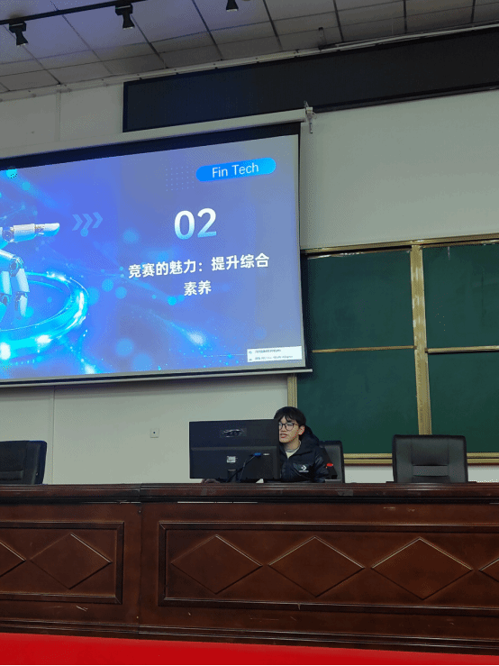 在经验分享环节,杨小慧和何睿分别分享了他们在学业和实践中的宝贵经验。杨小慧分享了她在信贷公司和政府的实习经历,鼓励同学们积极参与社会实践,积累经验。何睿则以“证书的力量、竞赛的魅力与时间管理”为主题,建议同学们在大一到大二期间考取英语四六级、计算机二级等基础证书,并根据兴趣选择其他专业证书。他还提到,金融科技竞赛如金砖国家职业技能大赛和工行杯竞赛,不仅能提升专业素养,还能积累人脉资源。