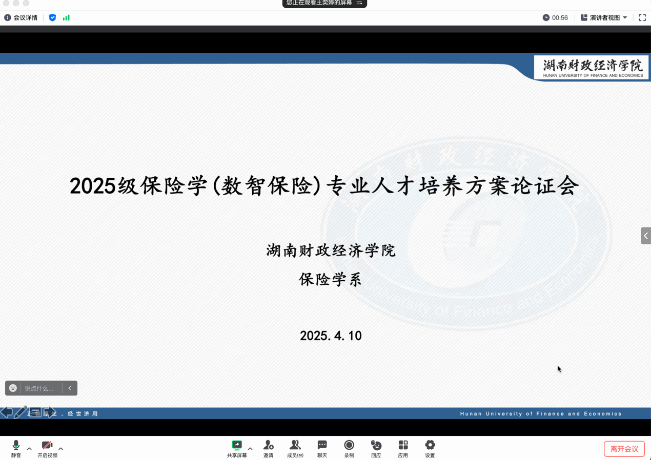 为提高专业建设与人才培养水平,构建高质量人才培养体系,我院于4月10日上午在腾讯会议召开线上2025级保险学(数智保险)专业人才培养方案论证会。本次论证会邀请了湖南大学金融与统计学院副院长张宁、中南林业科技大学经济与管理学院副教授樊毅、中华联合财产保险股份有限责任公司湖南分公司部门总经理阳增泉、中国人寿保险股份有限公司湖南省分公司团体业务部高级经理沈春宇、中国人寿保险股份有限公司业务经理徐展鹏五位校外评审专家。李艳丰副院长、保险学专业带头人林源教授以及保险学系教师王奕婷副教授、屠骞阳博士和司絮博士参加会议。