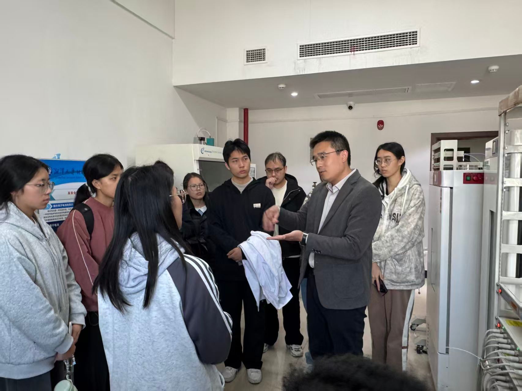 在湘潭大学侯鹏飞教授以及申丫、彭洁、张先俊三位博士的热情接待与细致讲解中,学生团队先后参观了柔性基底材料实验室、半导体功率器件分析平台等科研场所,近距离接触高温马弗炉、离子溅射仪等一系列高精尖仪器设备,初步了解了相关材料的制备流程与检测方法。