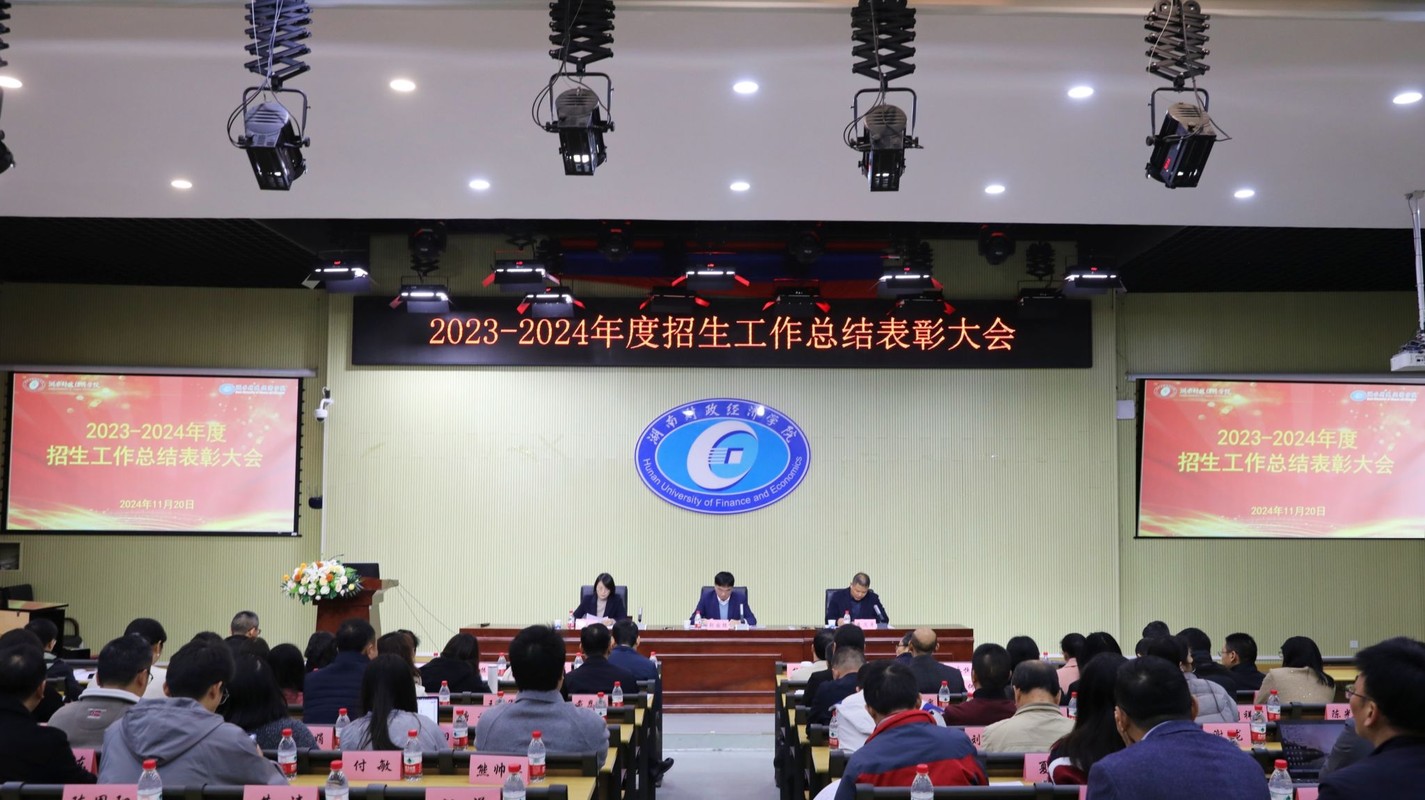 11月20日下午,Beat365召开招生工作总结表彰大会,对2023-2024年度招生工作进行全面总结,对在招生工作中表现突出、做出重要贡献的先进集体和先进个人进行隆重表彰。大会由教务处处长李茂平主持,副校长郭国强出席会议并讲话,各职能部门负责人,各二级学院院长、书记、教学副院长,以及参与了招生宣传活动的教师共200余人参加总结表彰大会。