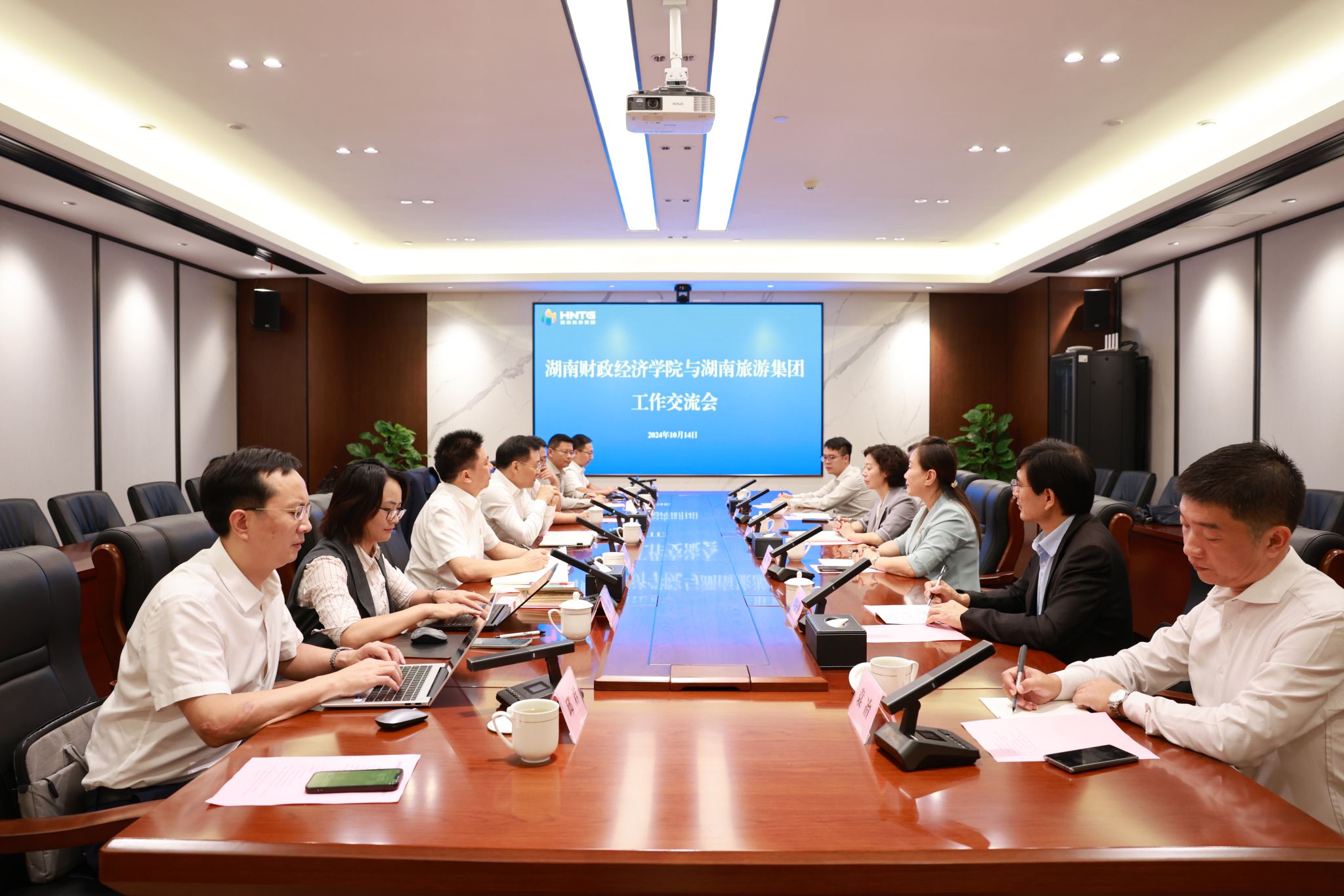 党委书记、董事长杨宏伟对杨兰英一行的到访表示热烈欢迎,对学校近年来在各个方面取得的优异成绩表示祝贺,学校对校友的关心、关爱表示感谢,并简要介绍了湖南旅游集团有关情况。他表示,希望双方发挥各自优势,深化产学研合作。加强沟通交流,着眼文旅产业布局,加大在“两个融合”、数智人才培养、实习实训就业等方面的合作力度。加快项目落地,拓宽产学研路径。细化对接机制,聚焦旅游研究、人才培养、投融资等重点领域,以产学研一体化合作项目为载体,助推校企合作实质性落地。强化金融科技赋能,提升产学研质效。突出前瞻布局和创新发展,加快培育文旅新质生产力,共同助力校企合作取得新成效。