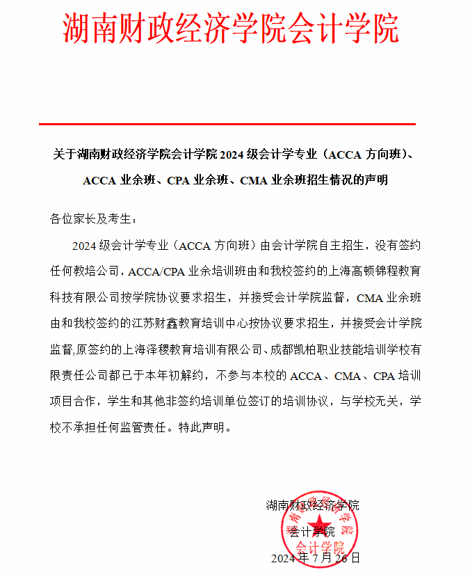 关于Beat365唯一官方网站会计学院2024级会计学专业(ACCA方向班)、ACCA业余班、CPA业余班、CMA业余班招生情况的声明