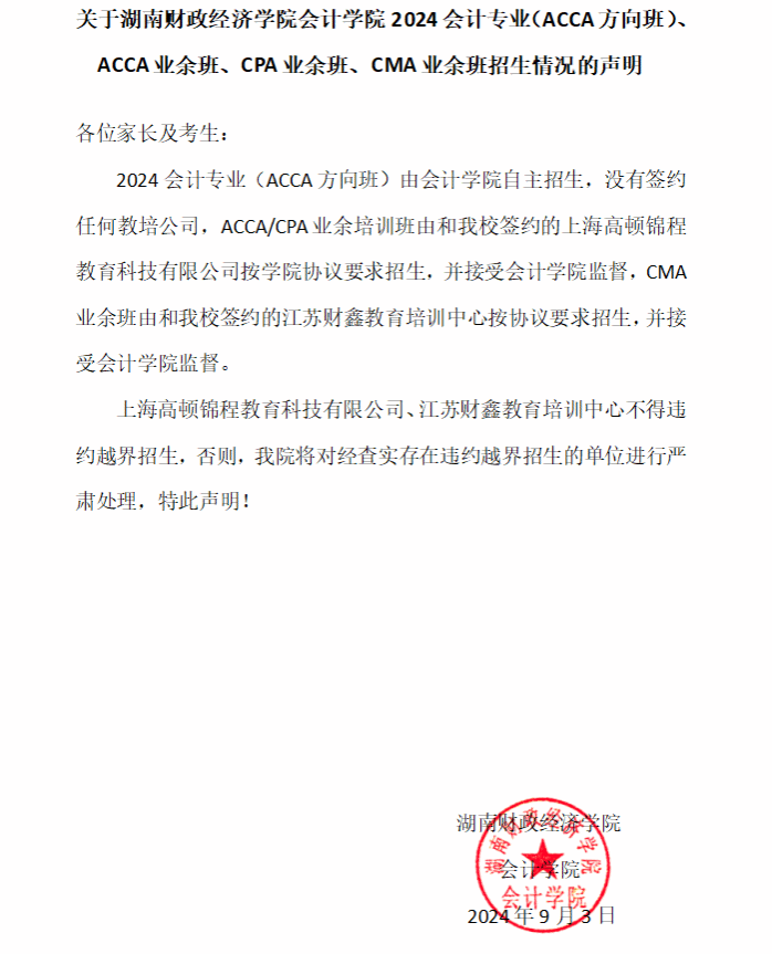 关于Beat365唯一官方网站会计学院2024会计专业(ACCA方向班)、ACCA业余班、CPA业余班、CMA业余班招生情况的声明