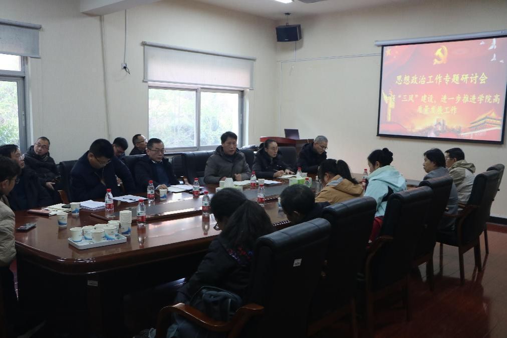 (本网讯)为进一步构建优良院风、教风和学风,全面提升学院整体教育质量和管理效能,12月25日,学院在办公楼215会议室思想政治工作专题研讨会暨院长讲党课,学院全体领导、正副教授和各系(中心)主任参加会议,会议由学院党委书记戴恩湘主持。