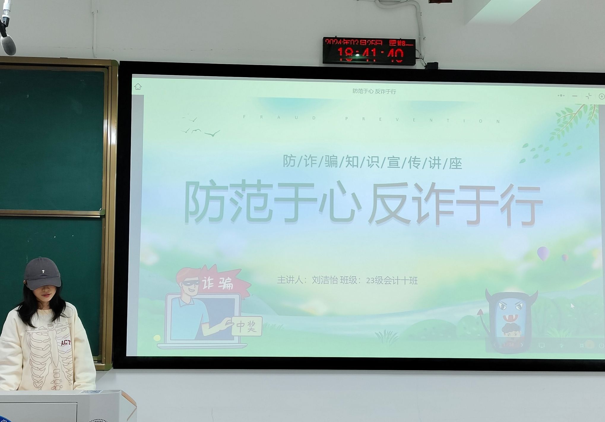 2024年3月25日晚18:00至18:45,我班于至诚楼六楼1604教室开展了第一次班会。此次班会目标是加强自我防范,提高防骗意识。此次班会由宣传委员刘洁怡同学负责,共分为五个章节。第一章节和第二章节科普了有关电信诈骗和网络诈骗的相关知识,让同学们对网络电信诈骗有更加深入的了解。 第三章节科普了一些常见的电信诈骗的手段和方法,拓宽同学们的眼界。并贴心给予了防骗提醒,点出反治方法。 第四、五章节讲述如何防范电信网络诈骗和遭到诈骗后的补救措施。最后还给了防诈骗小口诀:“陌生电话要警惕,可疑短信需注意;中奖退税送便宜,哄你汇钱是目的;暴利理财和投资,多是骗局莫搭理;刷卡消费欠话费,细分真伪辨猫腻;任凭骗术千万变,我自心中有主意;不理不信不汇款,小心谨慎防万一。”