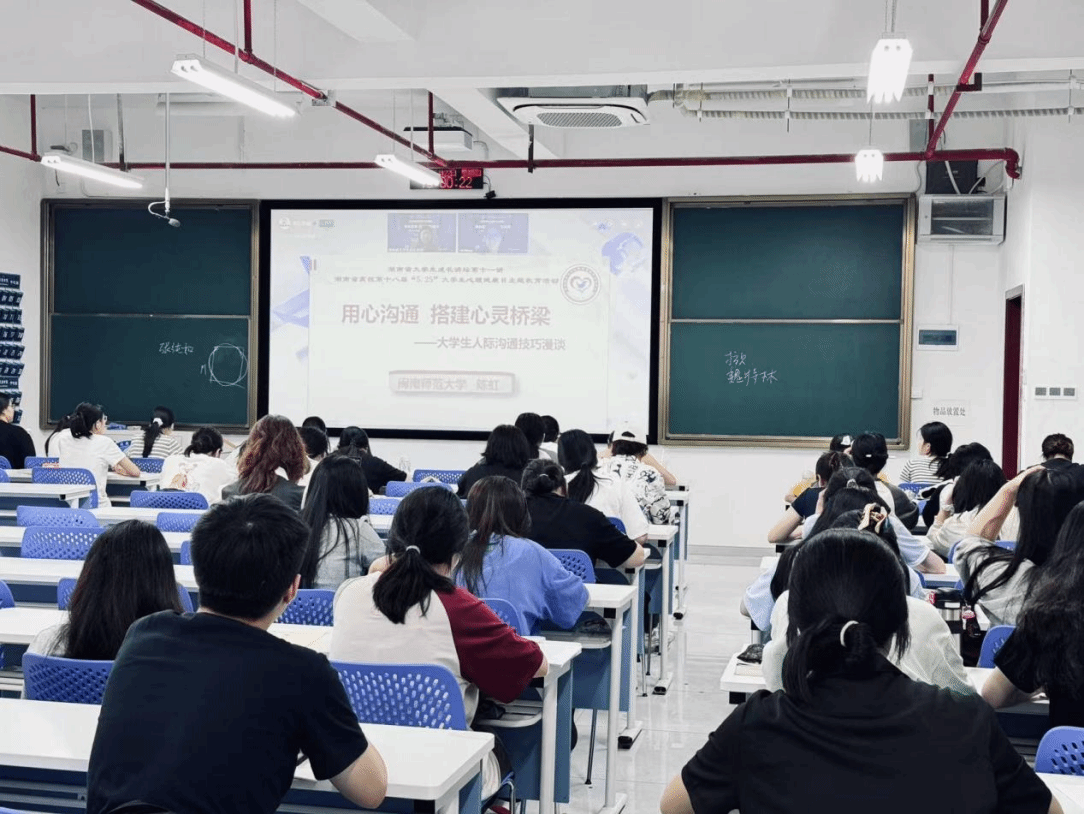 2025年5月22日晚,雷锋书院组织5800余名大一新生于各班晚自习教室同步观看湖南省大学生成长讲堂。闽南师范大学心理健康教育中心主任陈虹教授以《用心沟通,搭建心灵桥梁》为题,通过云端与学子展开深度对话。