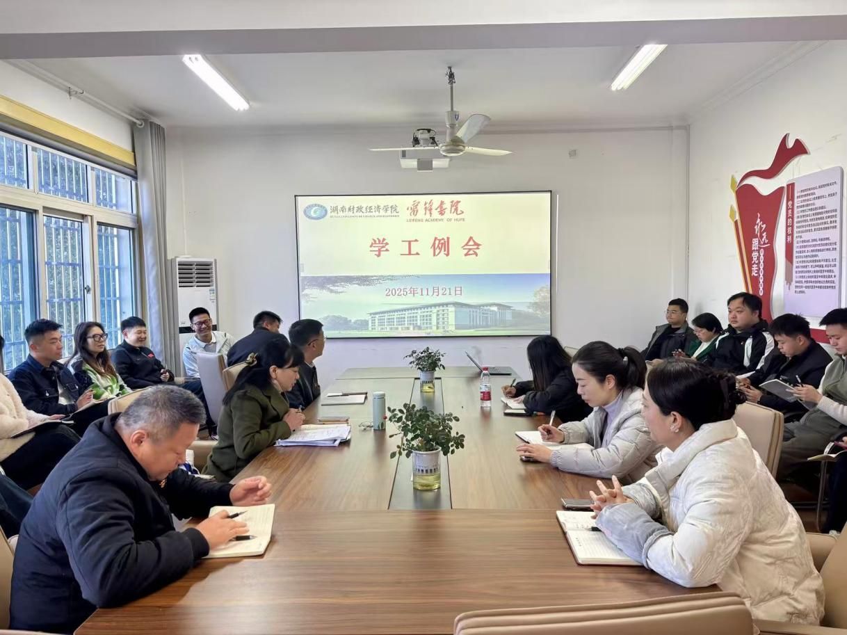 11月21日上午,雷锋书院在行政楼210会议室召开学生工作会议,此次会议由副书记黎红梅主持,副书记袁冶、副教授卿再花、副主任刘昊及学工办全体人员参加会议。