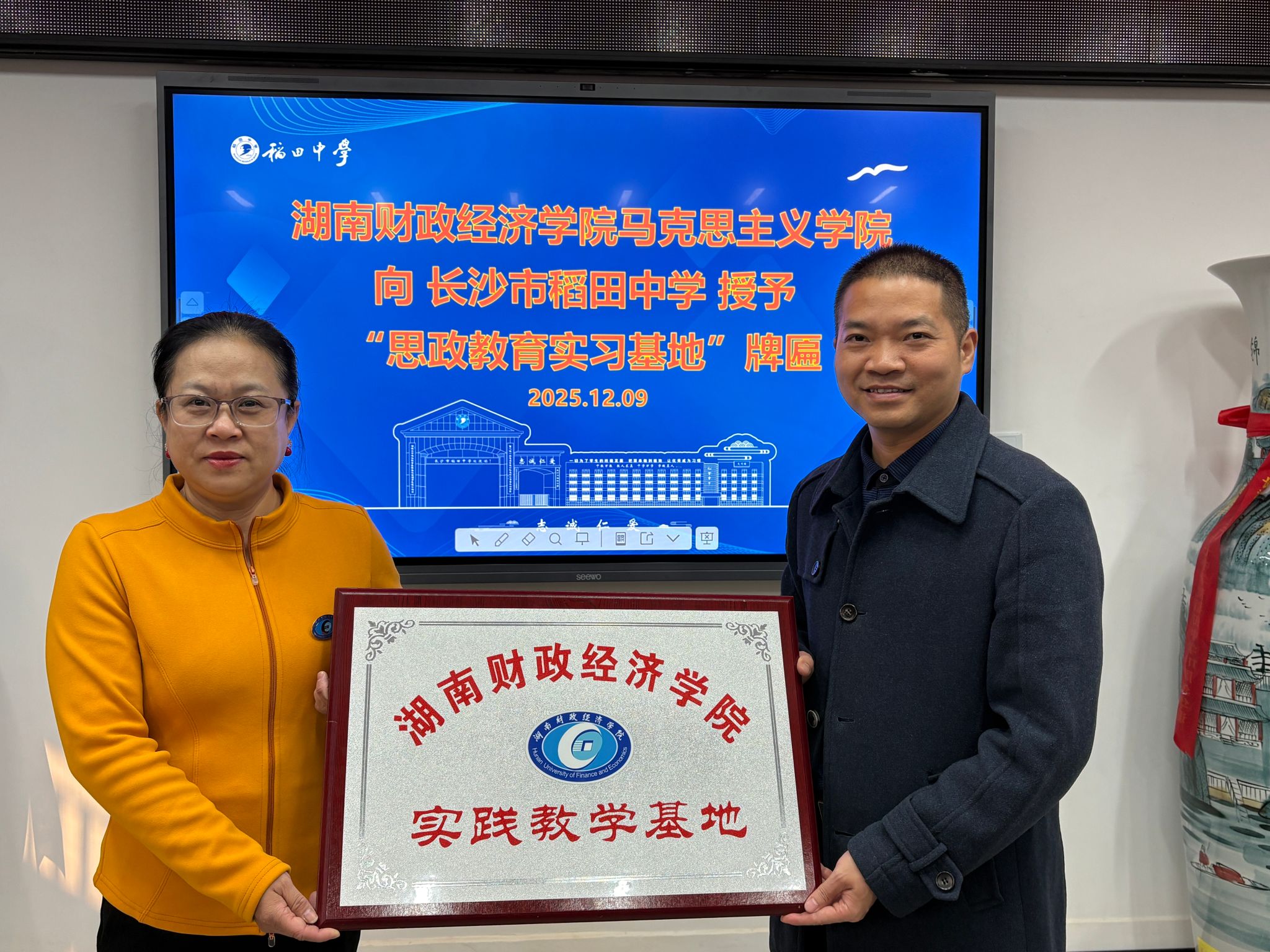 12月9日,我院赴长沙市稻田中学举行实践教学基地揭牌仪式。活动在稻田中学清廉讲堂举行,马克思主义学院党总支书记刘东艳、副书记游志能、思想政治教育专业教研室主任张晓敏参加本次活动。