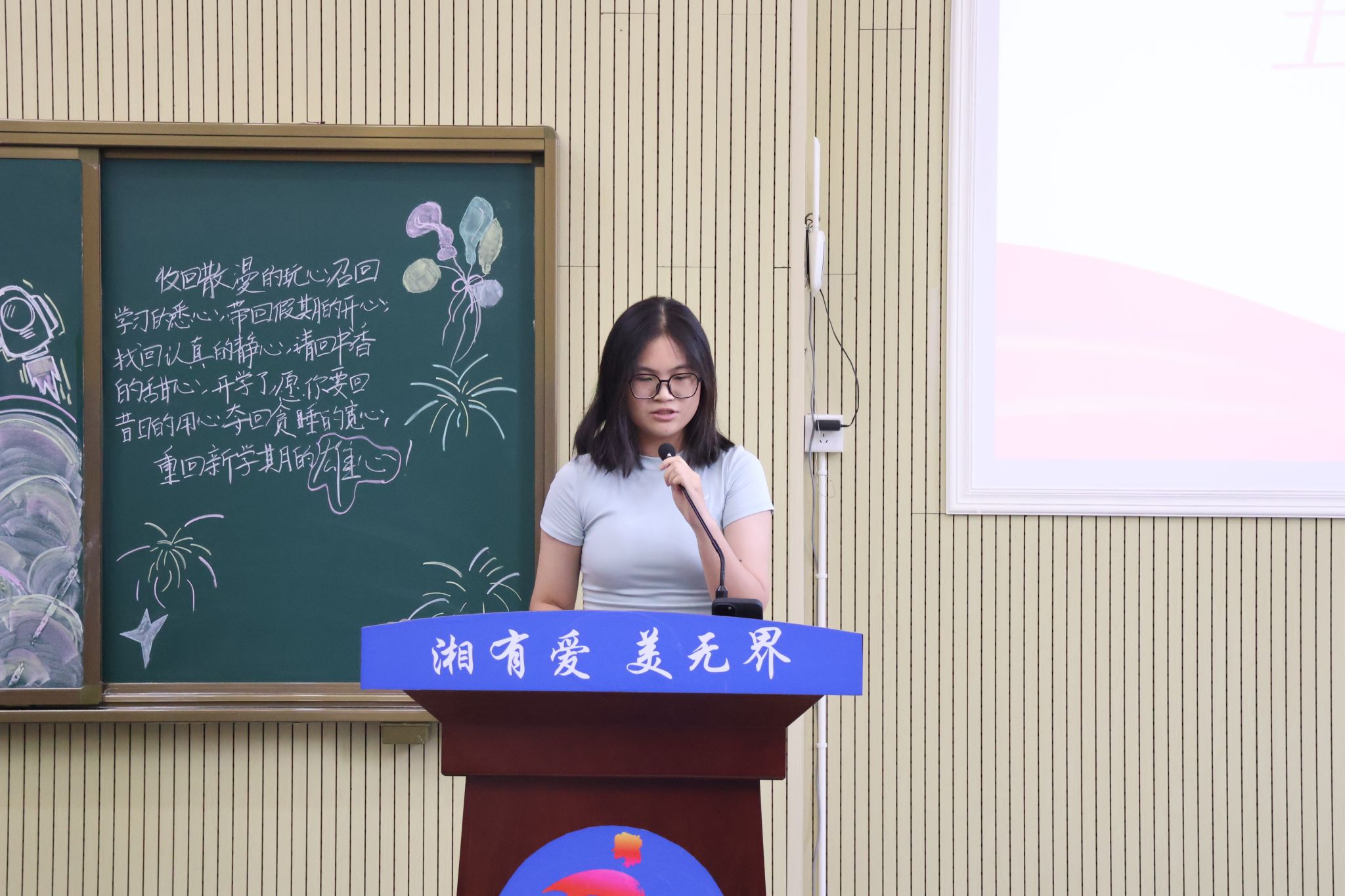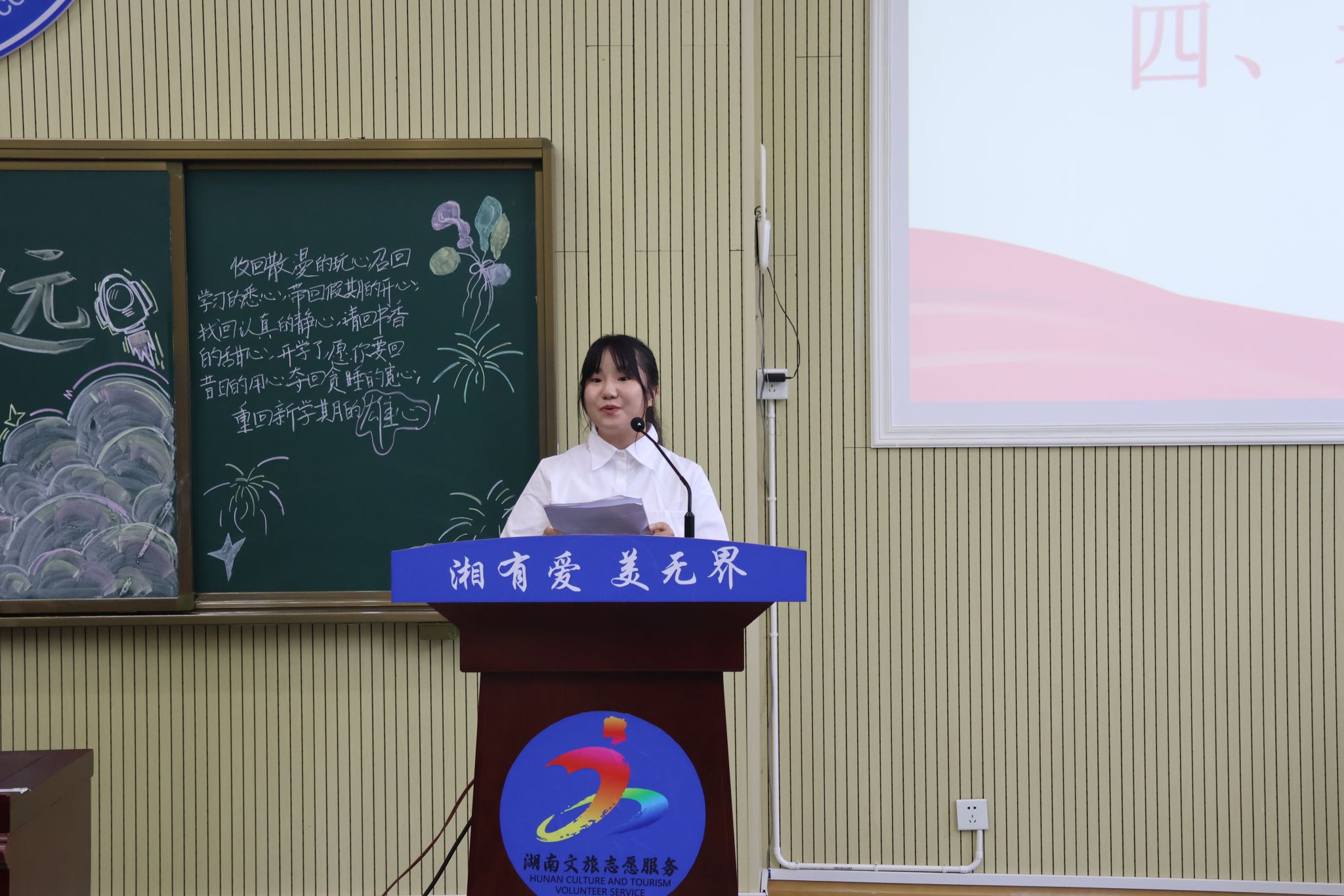 2024级思政一班邓静怡作为新生代表发言,表达了对大学生活的期待,号召同学们做好学生本职工作,锐意进取,于实践中锻炼本领。